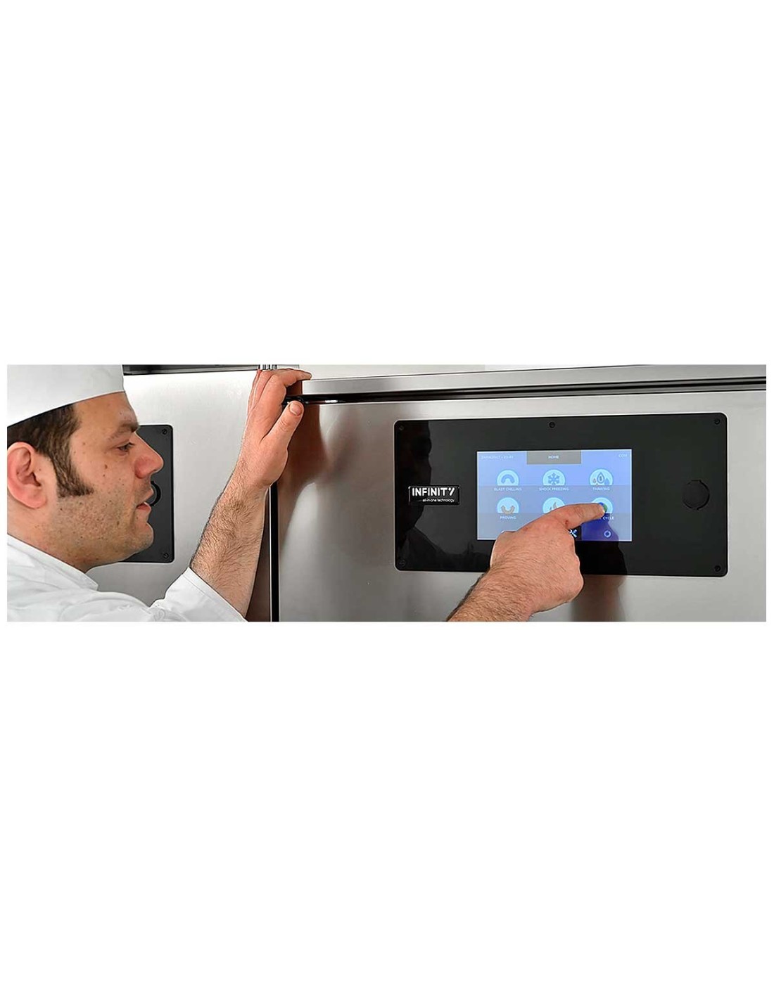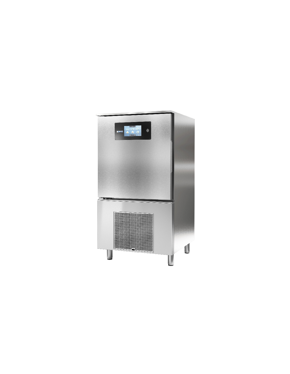 Abatidor multifunción para 10 bandejas GN 2/1 o 60x40 cm, con rendimiento de abatimiento 70 kg/ciclo (+90 °C a +3 °C en 90 min) y congelación 30 kg/ciclo (+90 °C a -18 °C en 240 min). Control mediante pantalla táctil 9", sonda multipunto (4 zonas) y acceso a datos HACCP con posibilidad de supervisión remota. Compatible con hasta 24 cubetas de helado. Medidas: 870 x 974 x 1650 mm.