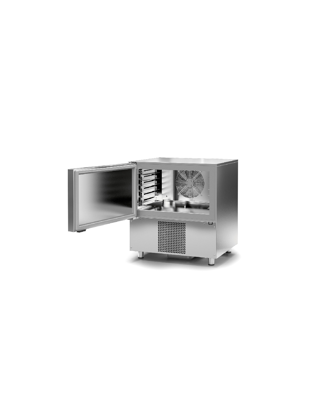 Abatidor compacto para 5 bandejas GN 1/1 o 60x40 cm con producción de 15 kg/ciclo en abatimiento y 5 kg/ciclo en congelación. Display LED multilingüe, sonda al corazón y estructura en acero VAR-PET antihuellas. Medidas: 760 x 710 x 830 mm.