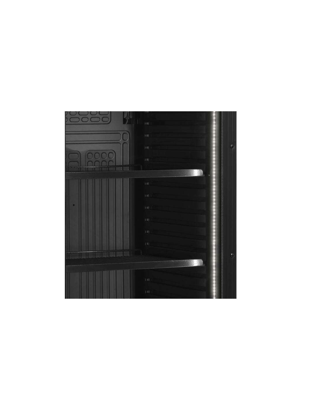 Armario expositor refrigerado color negro con capacidad de 372 litros y rango de temperatura +2/+10 °C, equipado con control mecánico, termómetro integrado y refrigeración estática asistida por ventilador. Iluminación LED en marco de puerta y doble cristal templado. Consumo 1,6 kWh/24h. Medidas: 595 x 600 x 1840 mm.