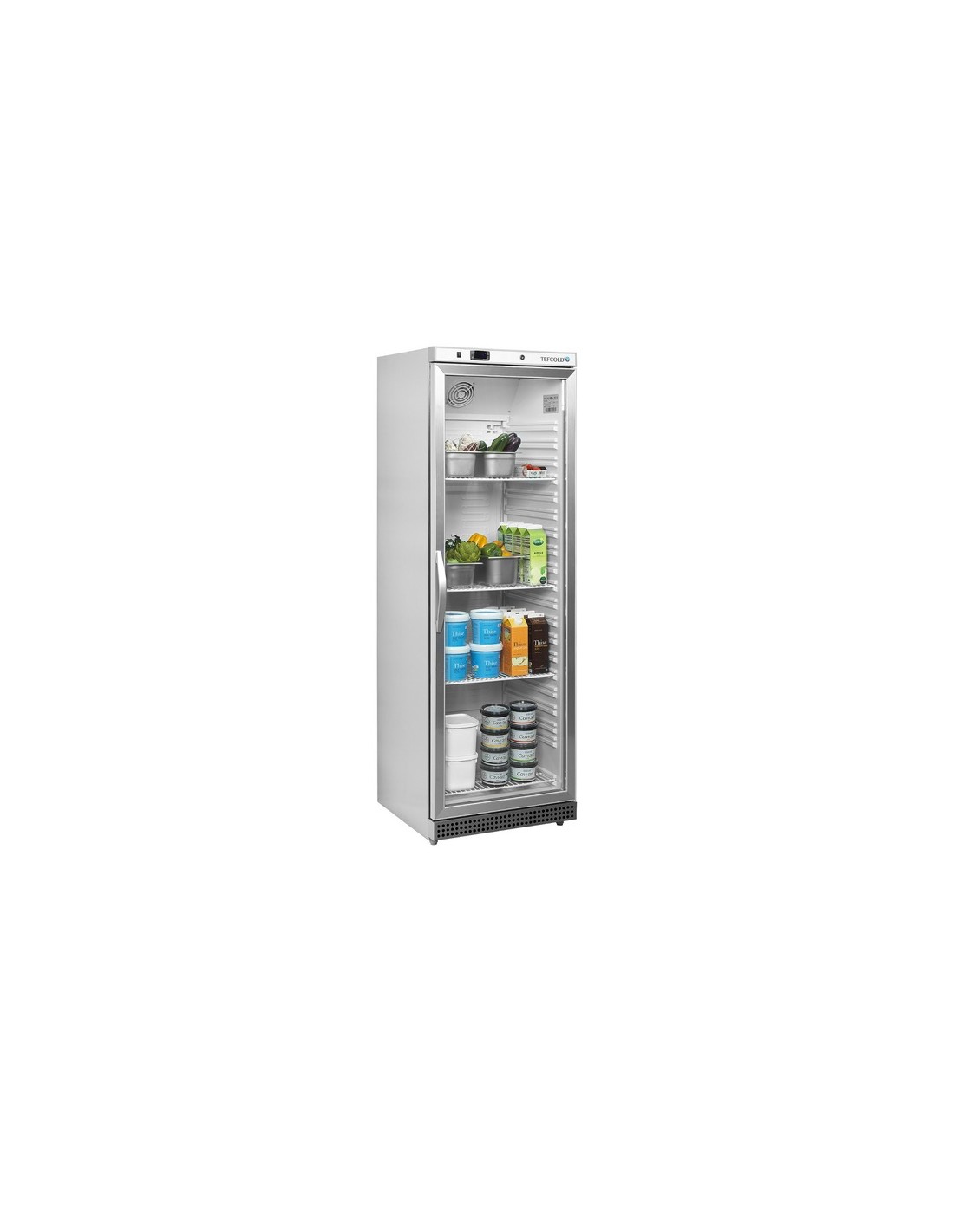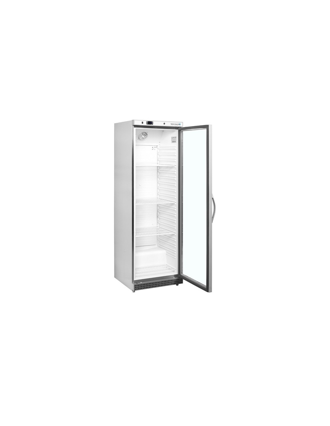 Expositor refrigerado con puerta de cristal reversible, 4 estantes ajustables y control digital con indicador de temperatura. Luz interior LED, refrigeración asistida por ventilador y patas ajustables con ruedas traseras. Capacidad para 448 latas de 330 ml. Medidas exteriores: 600 x 585 x 1855 mm. Rango de temperatura: +2/+10 ºC.