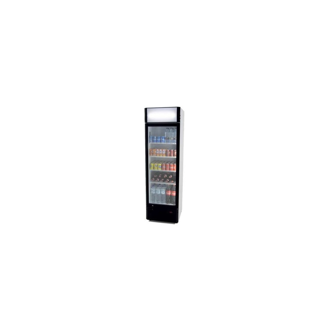 Armario expositor refrigerado con una capacidad de 360 litros. Está diseñado para refrigeración de bebidas y conservación de alimentos envasados. Cuenta con un termostato digital y sistema de evaporación automático. La refrigeración es estática asistida con ventilador. Capacidad: 420 latas de 33 cl.