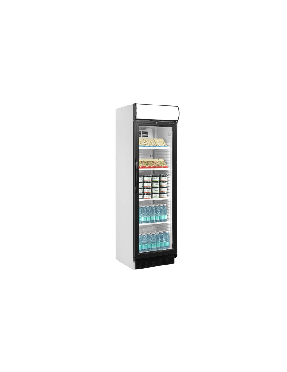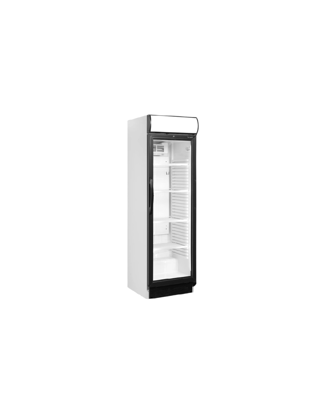 Armario expositor refrigerado CEV425CP-I de Tefcold, con puerta de cristal y capacidad de hasta 372 Litros. Este expositor refrigerado tiene un diseño bonito y elegante ideal para pequeños y grandes comercios. Equipado con termómetro y control de la temperatura mecánico. Incluye luz LED en el marco de la puerta y el cristal es doble templado. La refrigeración es estática asistida por ventilador con sistema de evaporación automático. Capacidad de 455 latas. Fabricación Europea.