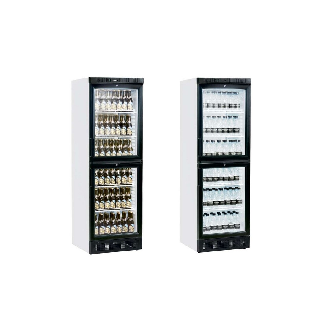 Armario expositor refrigerado 2 medias puertas de cristal. Tiene una capacidad de hasta 372 litros y 5 estantes de serie. Equipado con termómetro y control de la temperatura mecánico. El evaporador es estático asistido por ventilador. Incluye sistema de evaporación automático. Cuenta con luz LED y cristal doble templado. Capacidad: 455 latas de 33 cl.