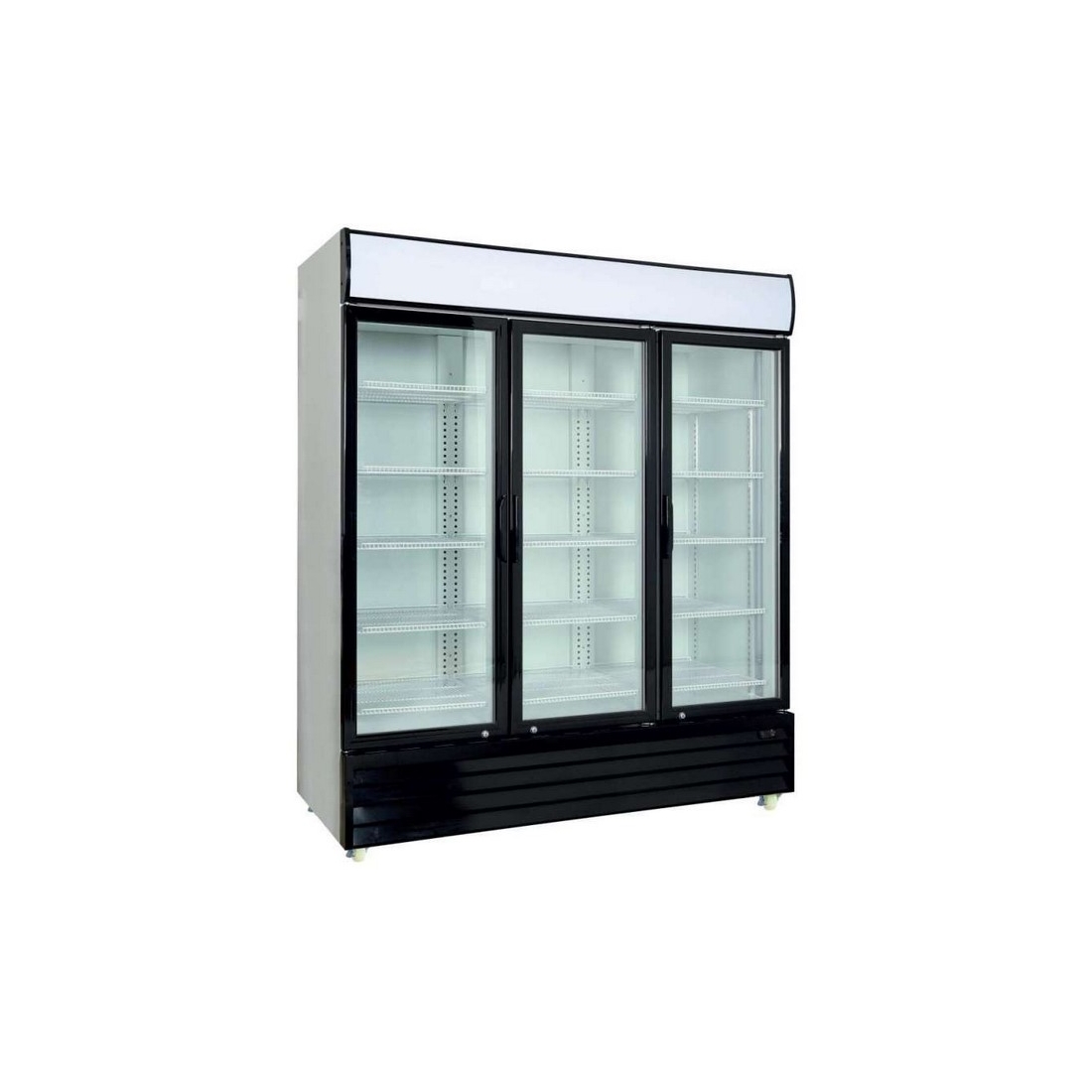 Armario expositor refrigerado 3 puertas batientes de cristal, con capacidad de hasta 1600 litros. Equipado con 15 estantes regulables en altura. Sistema anti condensación de las puertas. Sistema de enfriamiento dinámico con evaporador ventilado. Evaporación automática del agua de desescarche. Dispone de termostato digital Carel. Capacidad: 1840 latas de 33cl.