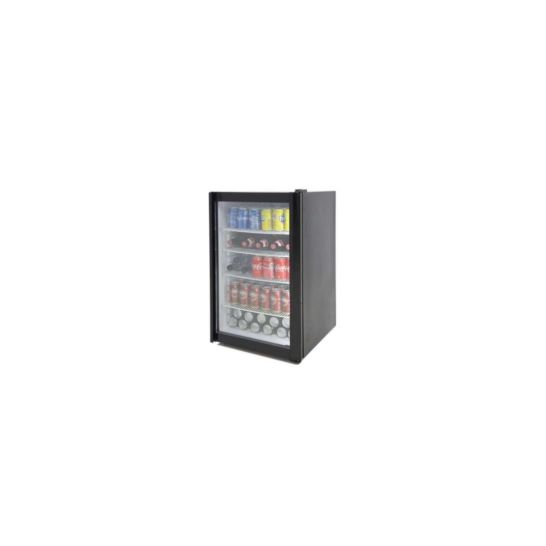 Armario expositor refrigerado de una puerta de cristal, con capacidad de 120 litros. Cuenta con dimensiones pequeñas, iluminación interior y cuatro estantes regulables en altura. Rango de temperatura ajustable entre +2 y +8ºC. Capacidad 200 latas de 33cl.