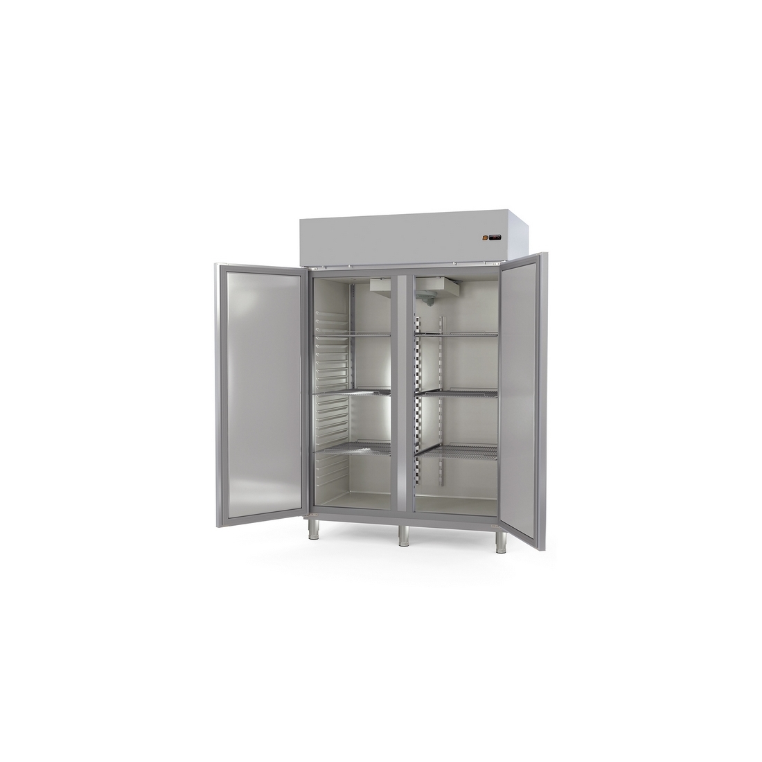 Armario Refrigerado Gastronorm GN2/1 AGD-140-PF Docriluc, construido completamente en acero inoxidable con unas dimensiones de 1350 x 850x 2130 mm, rango de temperatura ajustable de -2°C a +8°C y una capacidad de 1404 litros. Cuenta con características adicionales como, estantes ajustables, sistema de tiro forzado y control digital de temperatura y desescarches automáticos.