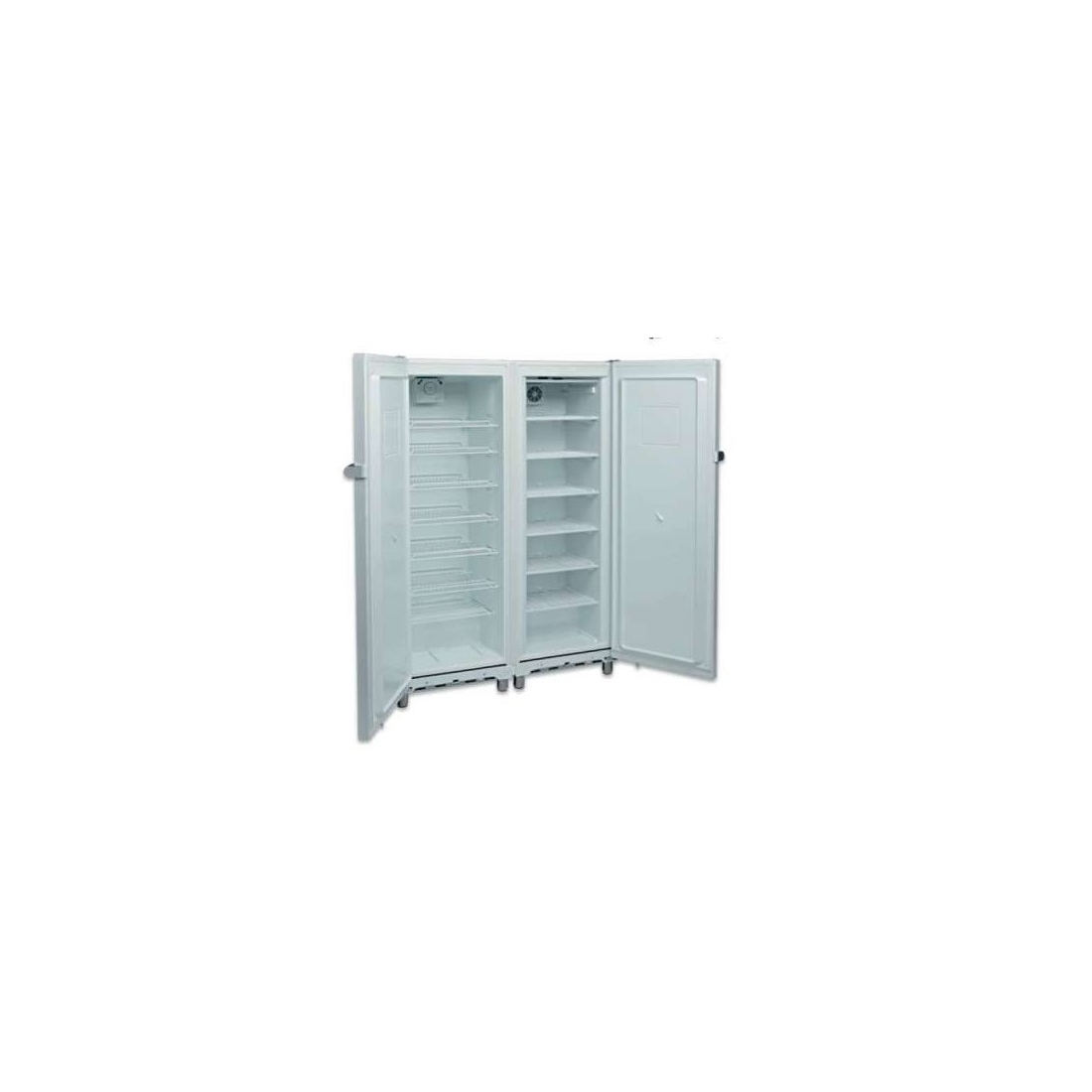 Este armario mixto tiene dos puertas, una para refrigeración y otra para congelación. Cuenta con una capacidad total de 700 litros. Está fabricado en Europea y es ideal para instalar en espacios de acceso complicado. Tiene una estética plana y las puertas están fabricadas en acero lacado. Equipado con desescarche automático en refrigeración y manual en congelación. El modelo de refrigeración tiene el evaporador ventilado y estático en congelación.