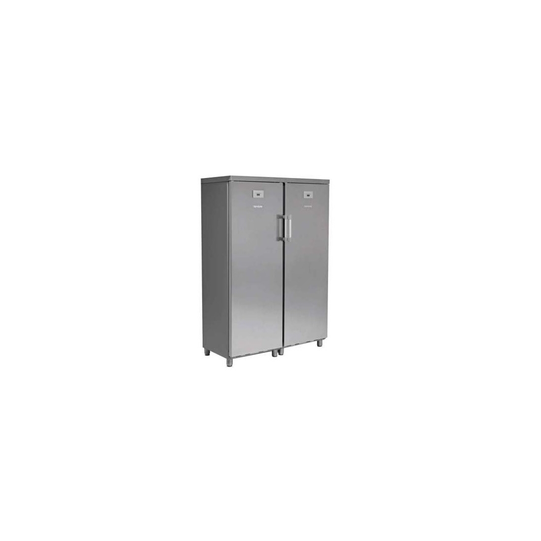 Este armario mixto tiene dos puertas, una para refrigeración y otra para congelación. Cuenta con una capacidad total de 700 litros. Está fabricado en Europea y es ideal para instalar en espacios de acceso complicado. Tiene una estética plana y las puertas están fabricadas en acero inoxidable. Equipado con desescarche automático en refrigeración y manual en congelación. El modelo de refrigeración tiene el evaporador ventilado y estático en congelación.