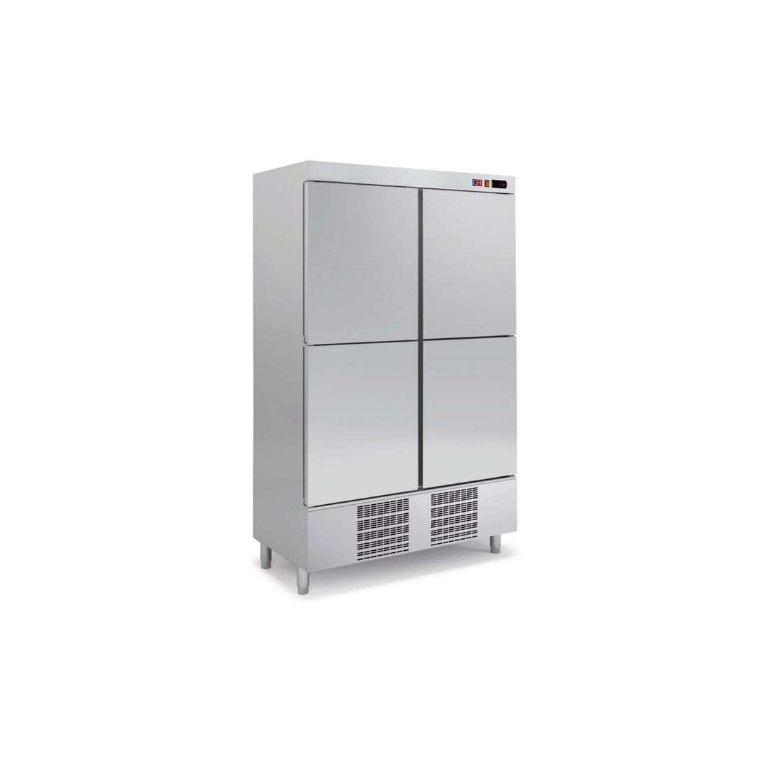Armario refrigerado 4 medias puertas, con una capacidad de 1000 litros. Está equipado con desescarche automático, evaporador de tiro forzado y control electrónico de la temperatura. Construido en acero inoxidable de alta calidad AISI-304, interior y exterior del mueble, fabricado en España. Fiabilidad garantizada.