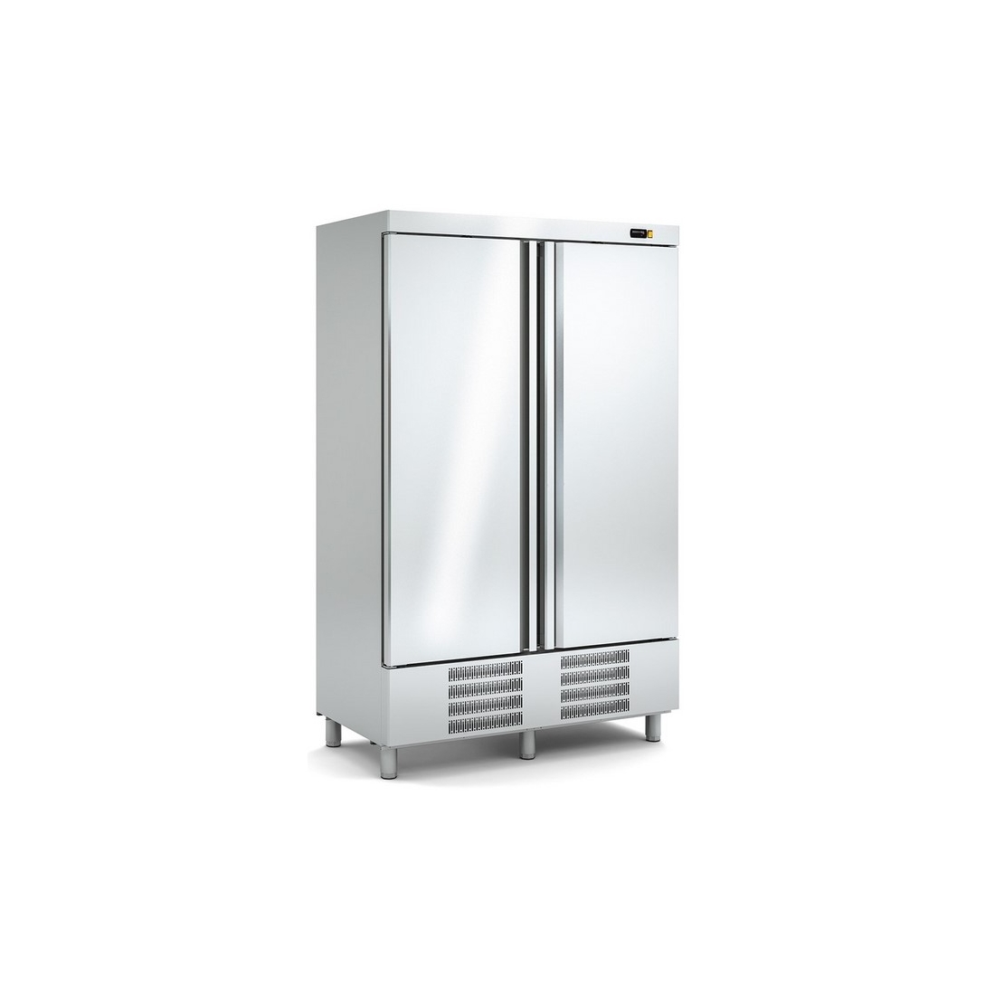 Armario frigorífico de 1201 litros, diseñado en acero inoxidable. Temperatura ajustable (-2°C a +8°C) y un consumo eléctrico eficiente (373W). Cuenta con estantes ajustables, sistema de tiro forzado, control digital de temperatura y desescarches automáticos. Ideal para entornos de hasta 40°C.