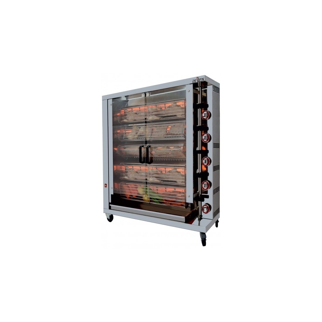 Asador de pollos con 5 espadas a gas. Tienen una capacidad entre 20 y 30 pollos. Quemadores muy potentes con gran poder calorífico. Estos asadores disponen de una gran variedad de accesorios que permiten asar pollo, conejo, paletilla de cordero, pavo, cochinillo, jamones, codillo, patata, pimiento, chorizo, butifarra...