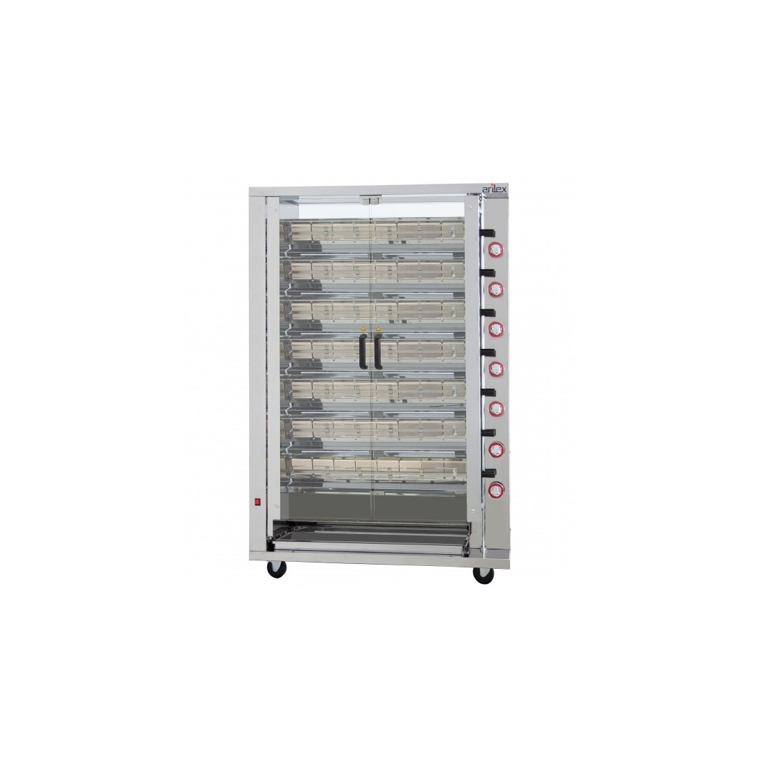 Asador de pollos con 7 espadas a gas. Tienen una capacidad entre 28 y 42 pollos. Quemadores muy potentes con gran poder calorífico. Estos asadores disponen de una gran variedad de accesorios que permiten asar pollo, conejo, paletilla de cordero, pavo, cochinillo, jamones, codillo, patata, pimiento, chorizo, butifarra...