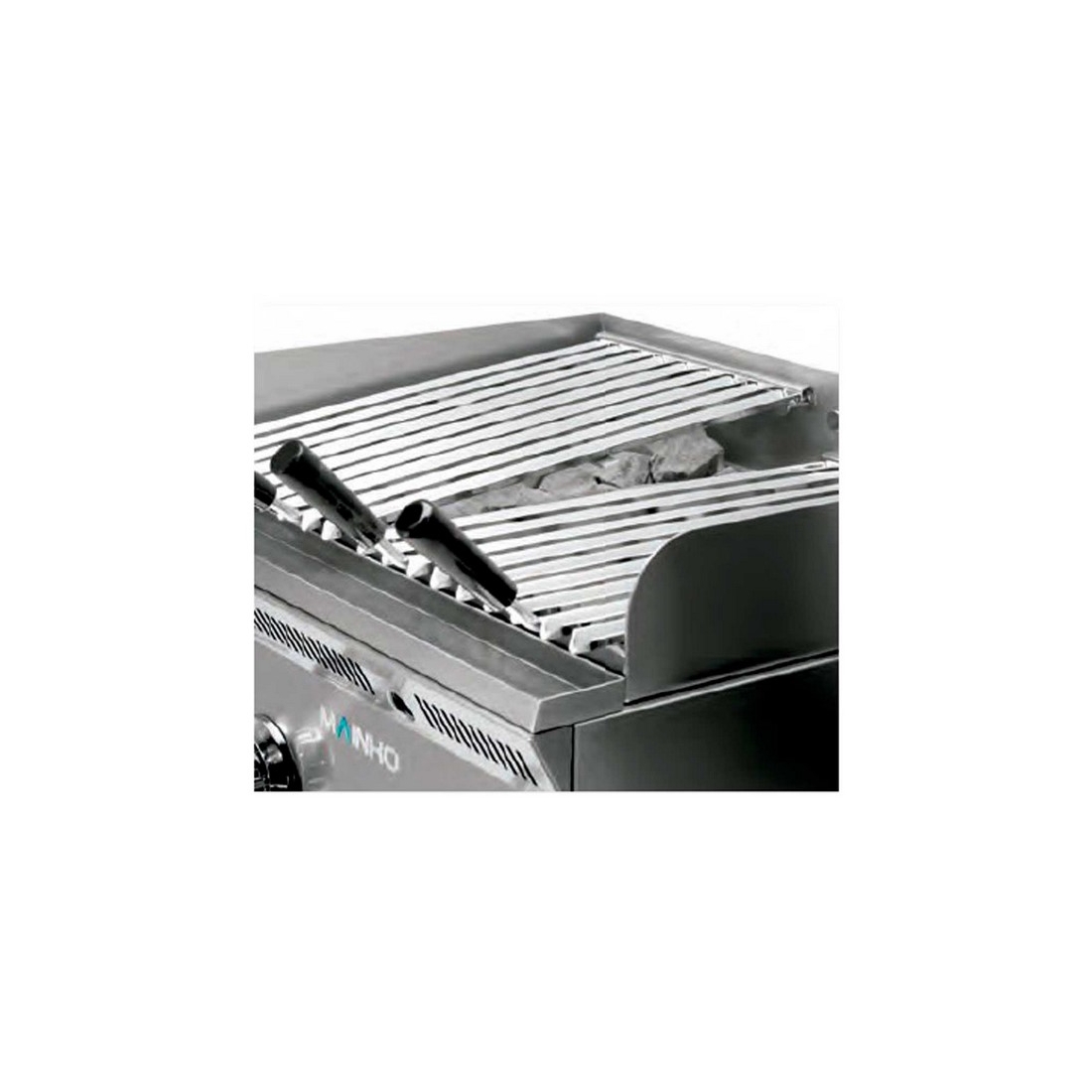 Barbacoa Profesional 60cm ELBI62G de Mainho, es un modelo de alta potencia, con calentamiento mediante piedra volcánica para cocción perfecta. Zonas independientes para versatilidad culinaria. Control total con válvulas de seguridad y termopar.