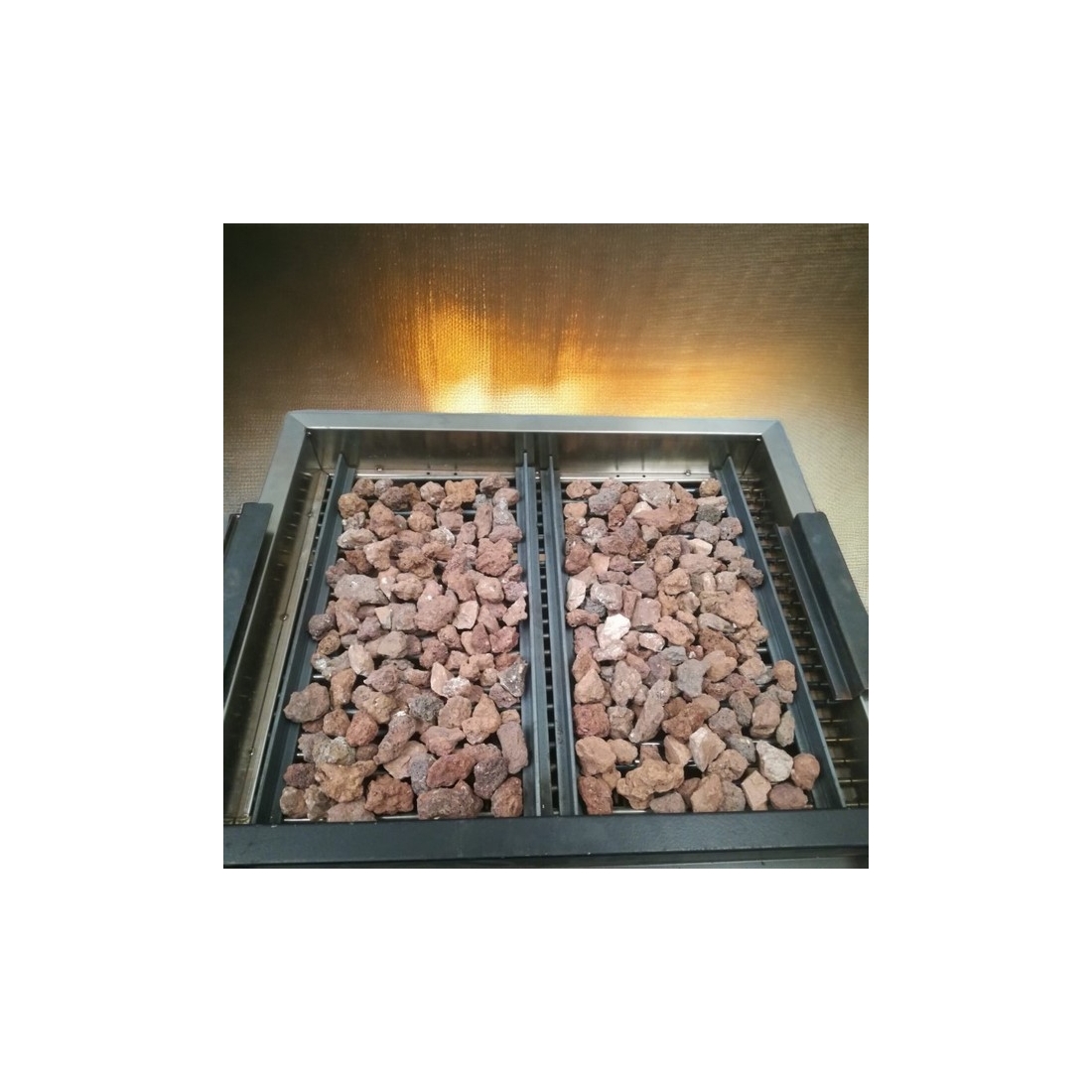 - Cuenta con una robusta Parrilla interior porta lava volcánica, extraible y diseñada para soportar altas temperaturas sin alterarse o desoldarse.