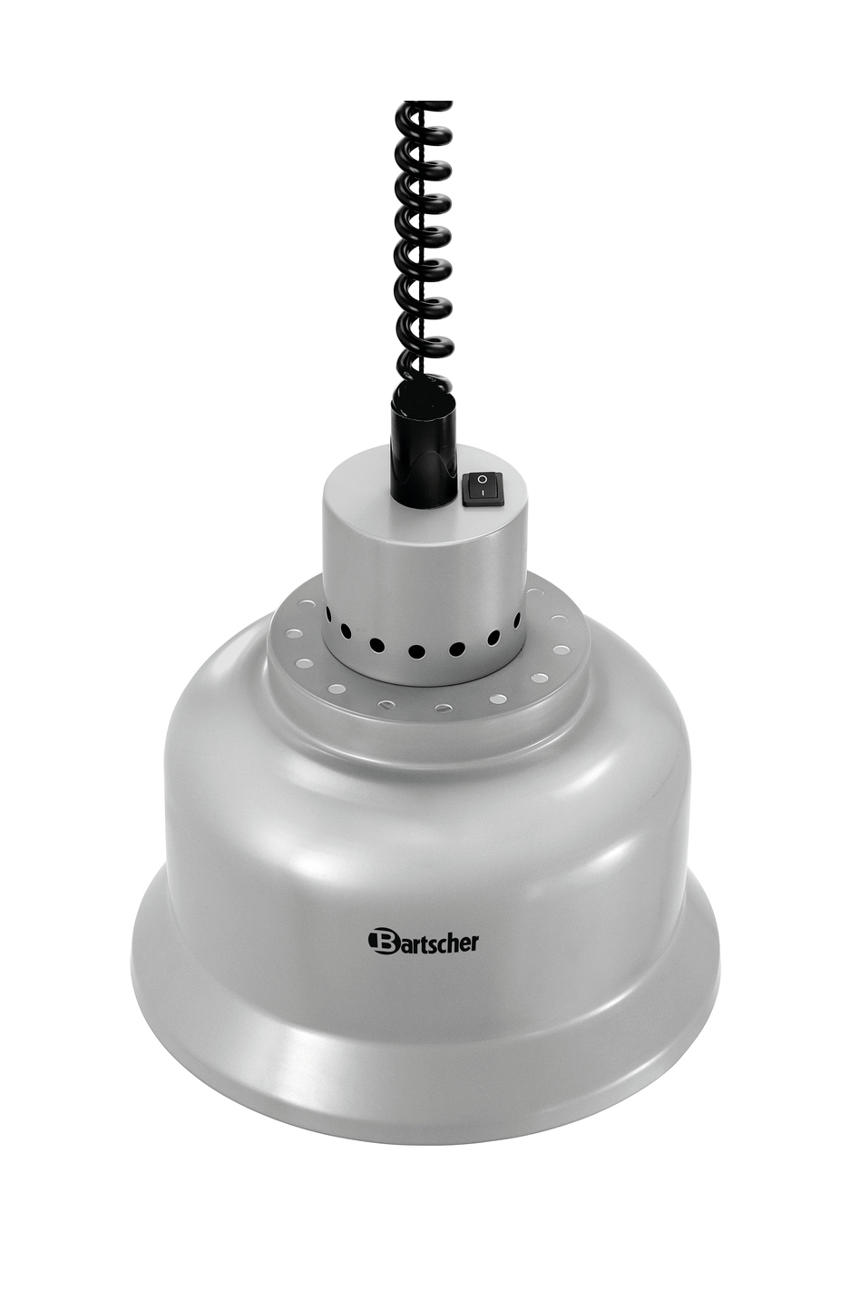 Lampara para el mantenimiento de alimentos calientes en negocios de restauración. Cuenta con un sistema colgante regulable en altura, con cable en espiral, regulable desde 650mm hasta 1600mm. El calentamiento se realiza mediante bombilla de infrarojos. Color plateado mate.