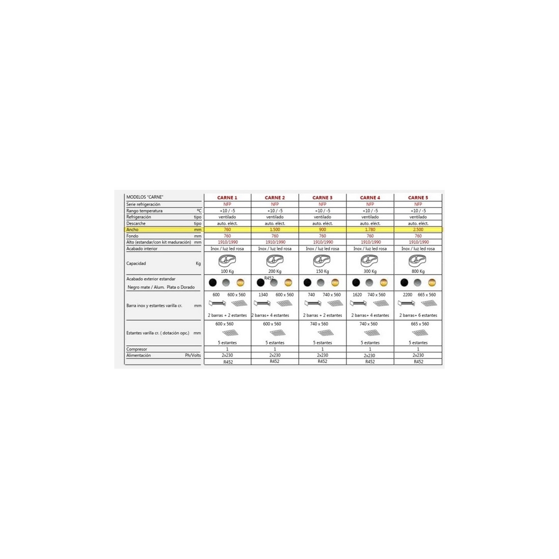 Descubre esta joya de exposición y maduración de carne con elegante acabado en acero inoxidable. Gracias a la potente tecnología Meat Line, garantiza la máxima calidad en la maduración de tus productos. Con un diseño vanguardista, este armario ofrece funcionalidad y estilo en cada detalle. Medidas: 1500 x 760 x 1990 mm. + También disponible con acabados en negro mate o dorado.