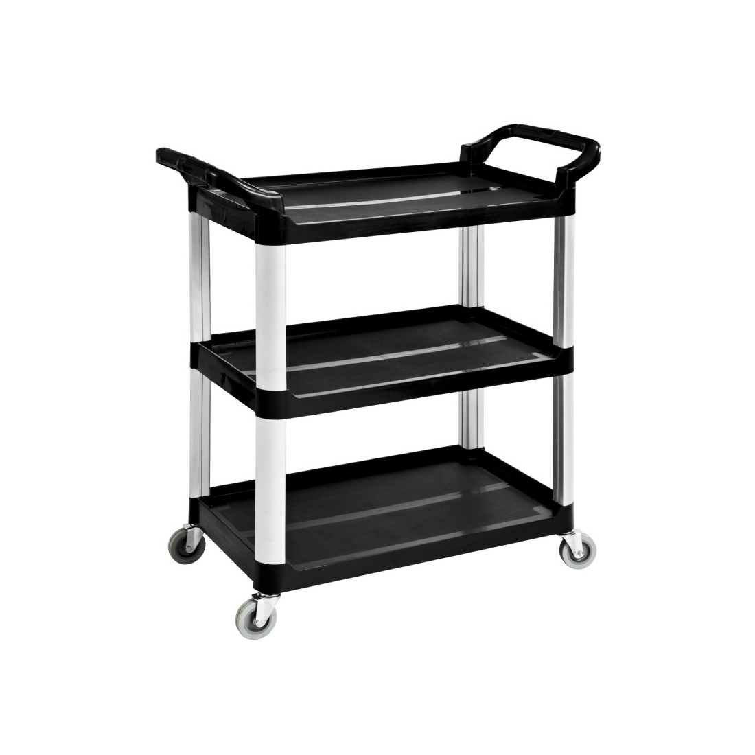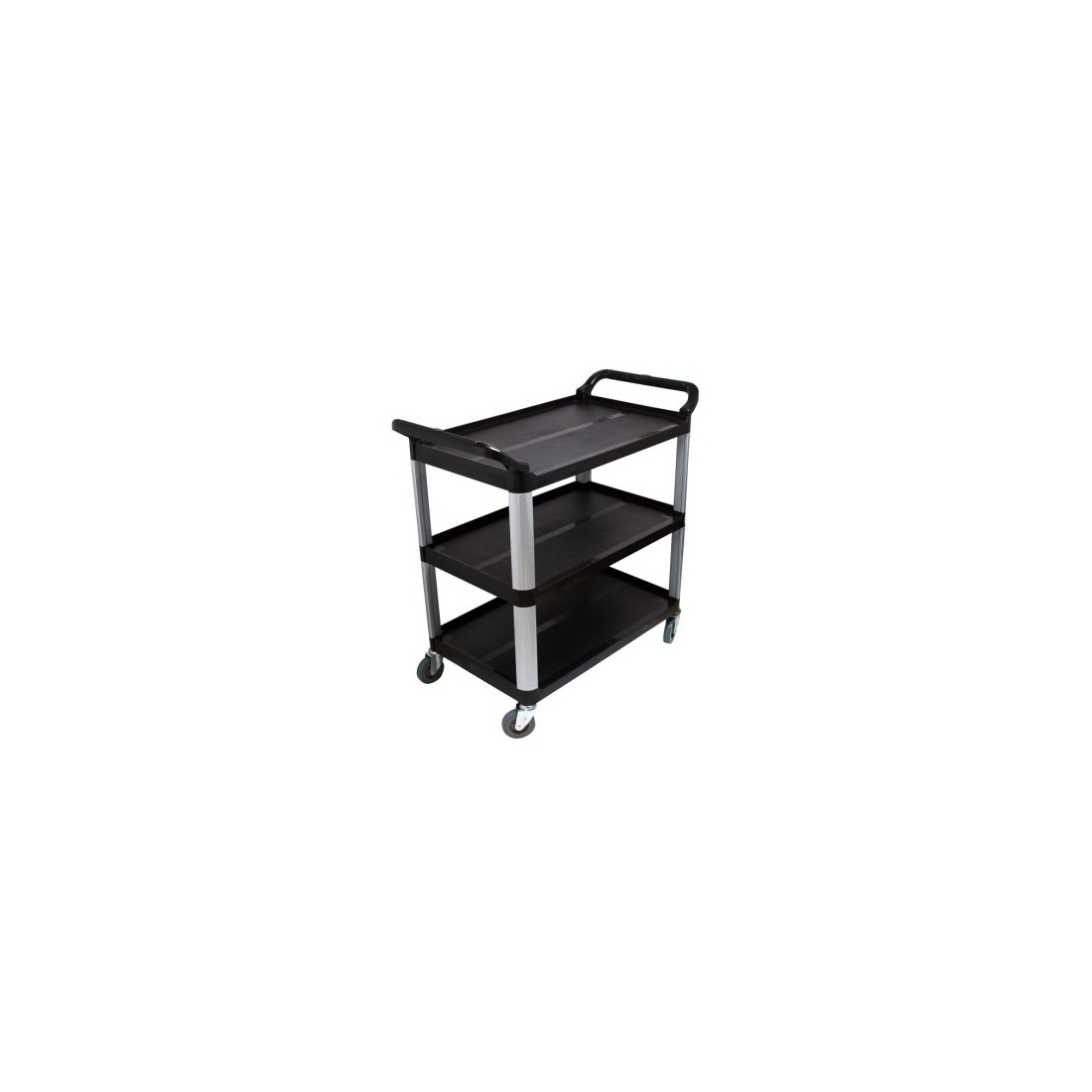 Carro de transporte para servicios de hosteleria con dos tres estantes. Está fabricado en polipropileno y aluminio anodizado, y tiene una capacidad de hasta 50 Kg por estante.