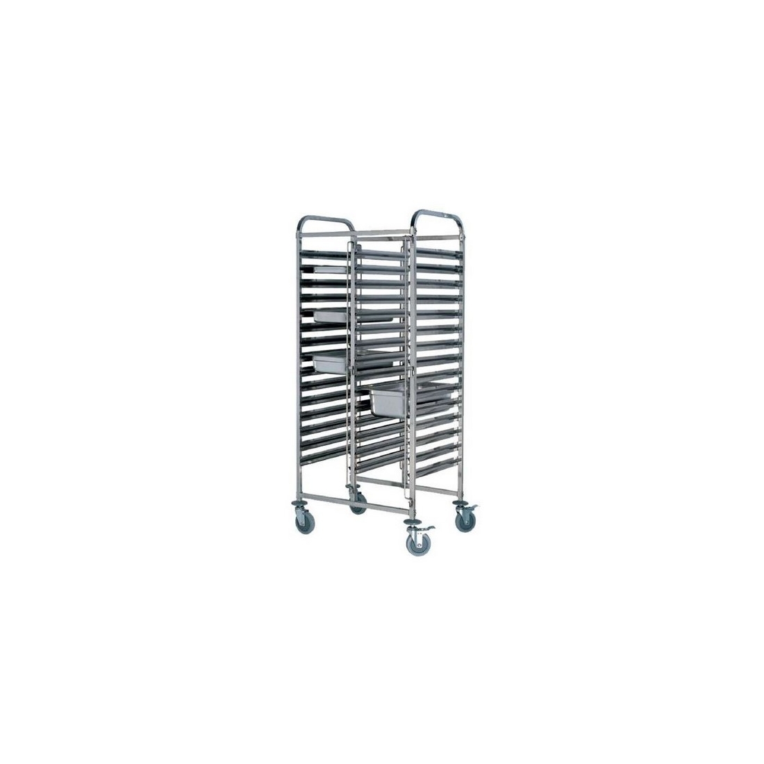 Carro de bandejas para hostelería doble con 30 guías de bandejas Gastronorm GN 1/1. Cuenta con 4 ruedas, dos de ellas con freno y sistema de cierre lateral para evitar la caída de las bandejas durante el desplazamiento.