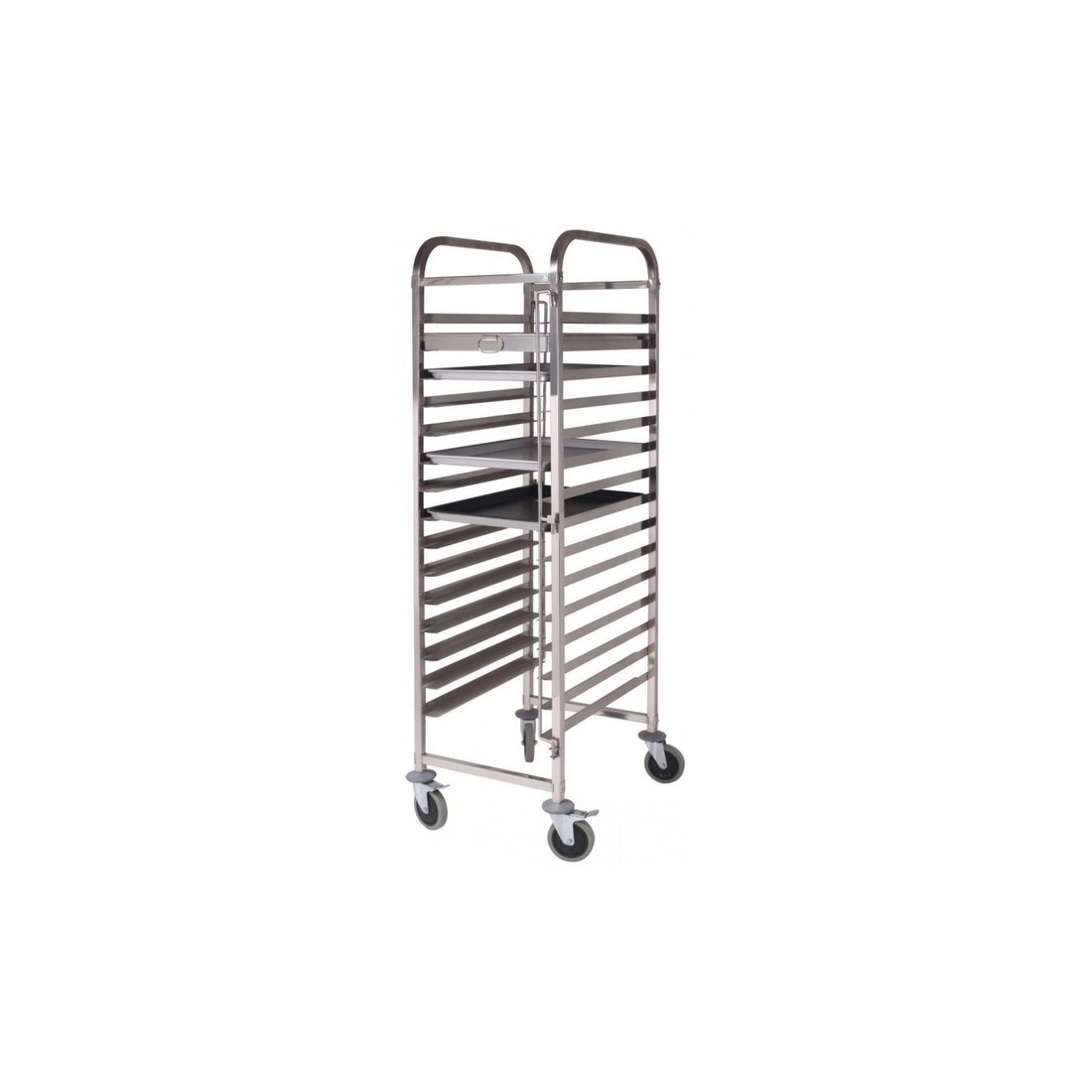 Carro de bandejas para panaderías y pastelerías con 15 guías de bandejas de 60x40cm. Cuenta con 4 ruedas, dos de ellas con freno y sistema de cierre lateral para evitar la caída de las bandejas durante el desplazamiento.
