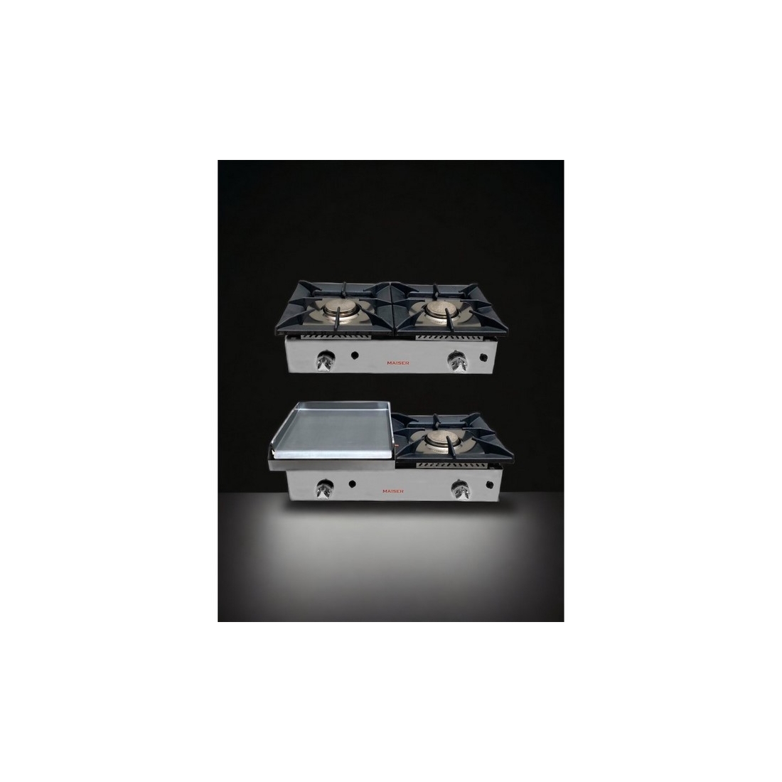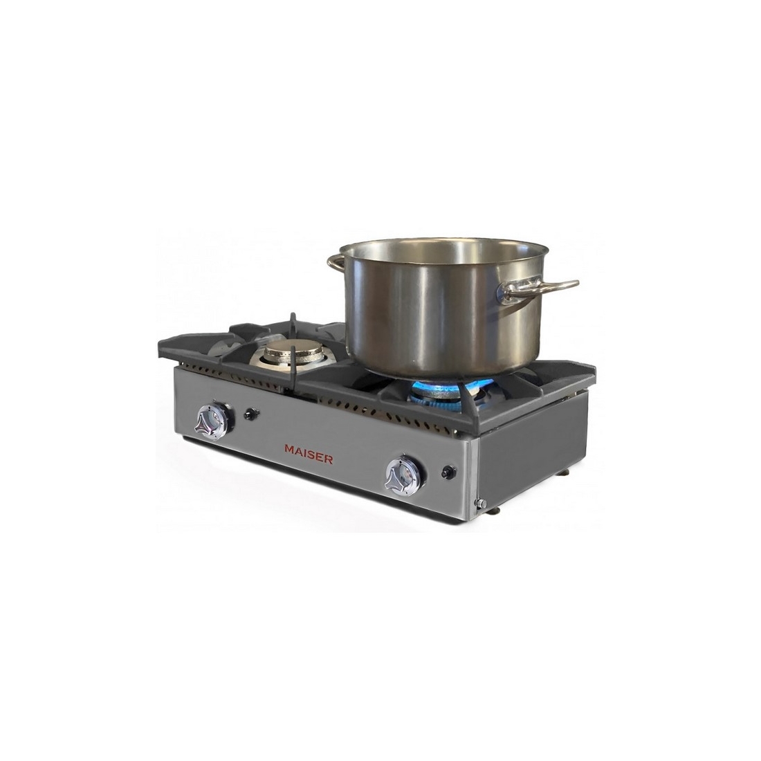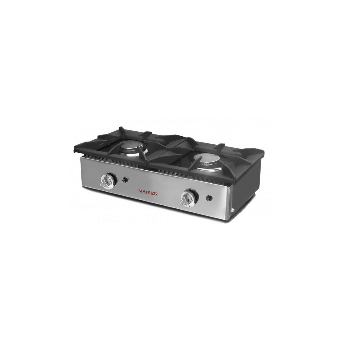 Cocina Industrial Dos Fuegos CG2F de Maiser, fabricada en España con materiales de calidad y quemadores de alto poder calorífico Italiano. Cuenta con 12Kw de potencia, parrillas de hierro fundido robustas, mandos metálicos de zinc y termopar de seguridad.