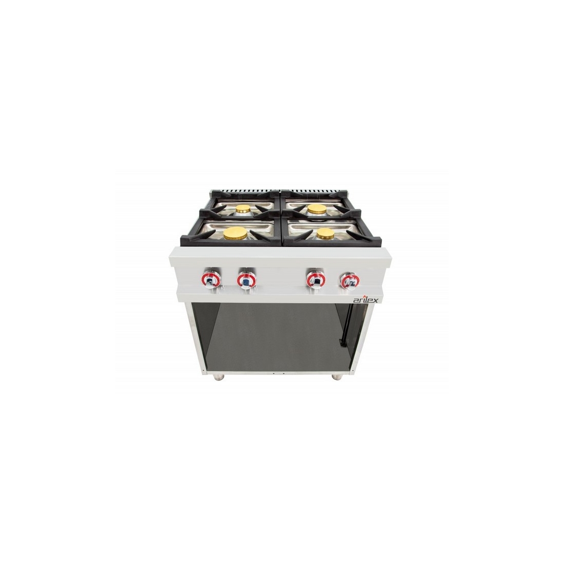 Cocina industrial de 4 fuegos con mueble 80CG70 de ARILEX, cuenta con una potencia total de 26Kw repartidos entre sus cuatro quemadores, que están equipados con termopar de seguridad y llama piloto. Fabricación Española.