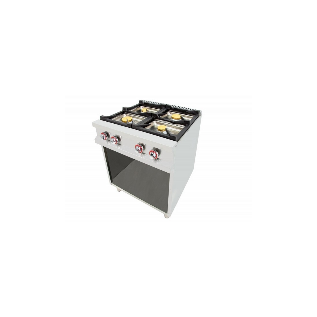 Cocina a gas industrial de cuatro quemadores con mueble. Cuenta con parrillas de hierro fundido de 370x300mm. Dispone de termopar de seguridad y llama piloto. Su encendido es piezoeléctrico. Fabricación Española