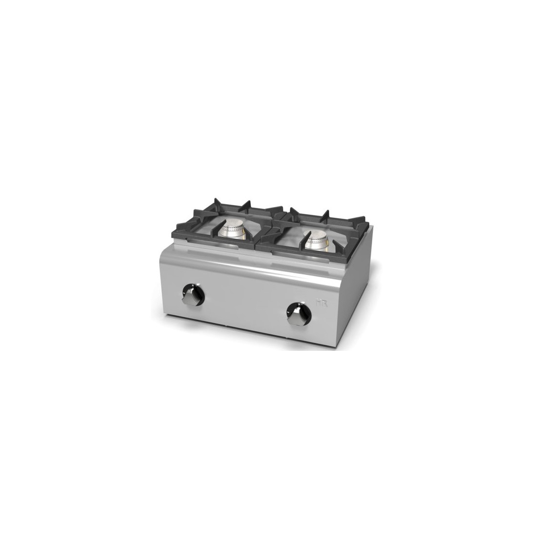 Cocina a gas de sobremesa con 2 Fuegos FG600 de HR FAINCA, con fuegos superiores de gran rendimiento calorífico y parrillas de hierro fundido. Este fogón industrial de fondo 500 cuenta con dos quemadores 11 Kw y termopar de seguridad. Fabricación Española.