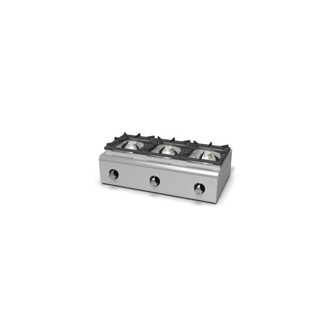 Cocina a gas de sobremesa con 3 Fuegos FG900 de HR FAINCA, con fuegos superiores de gran rendimiento calorífico y parrillas de hierro fundido. Este fogón industrial de fondo 500 cuenta con tres quemadores 16,5 Kw y termopar de seguridad. Fabricación Española.