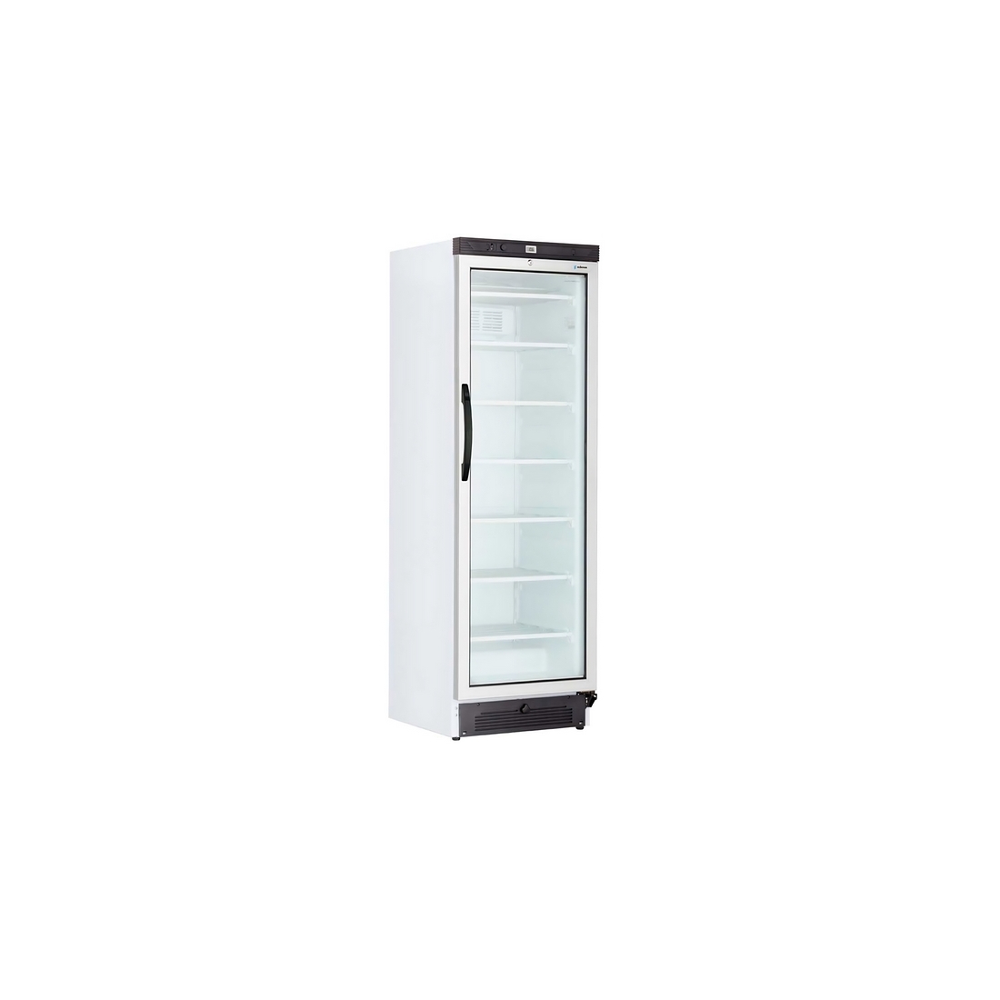 Armario expositor para alimentos congelados con iluminación interna. Sus medidas son 595 x 600 x 1825 mm, capacidad de 300 litros, y un amplio rango de ajuste de temperatura de -12ºC a -22ºC. Incorpora 6 estantes evaporadores. Destaca por su eficiencia energética y su clasificación climática de Categoría 4.