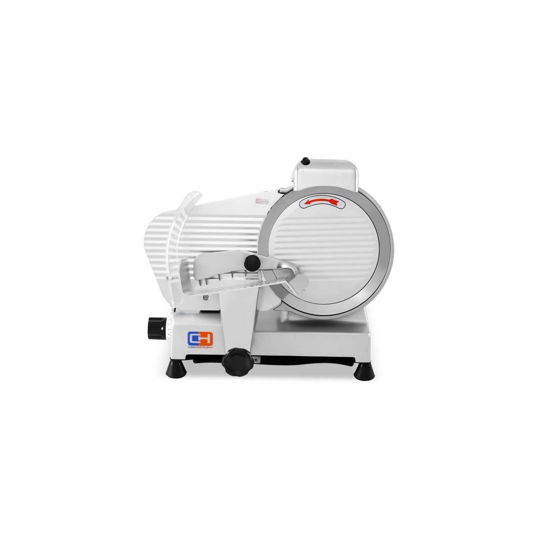 Cortadora de Fiambre MS-250 de Clima Hostelería, construida en aluminio fundido y barnizado. Este modelo de cortadora cuenta con cuchillas inox y afilador incorporado. El motor cuenta con protector térmico para evitar sobrecalentamiento y esta equipada con un relé para su rearme.