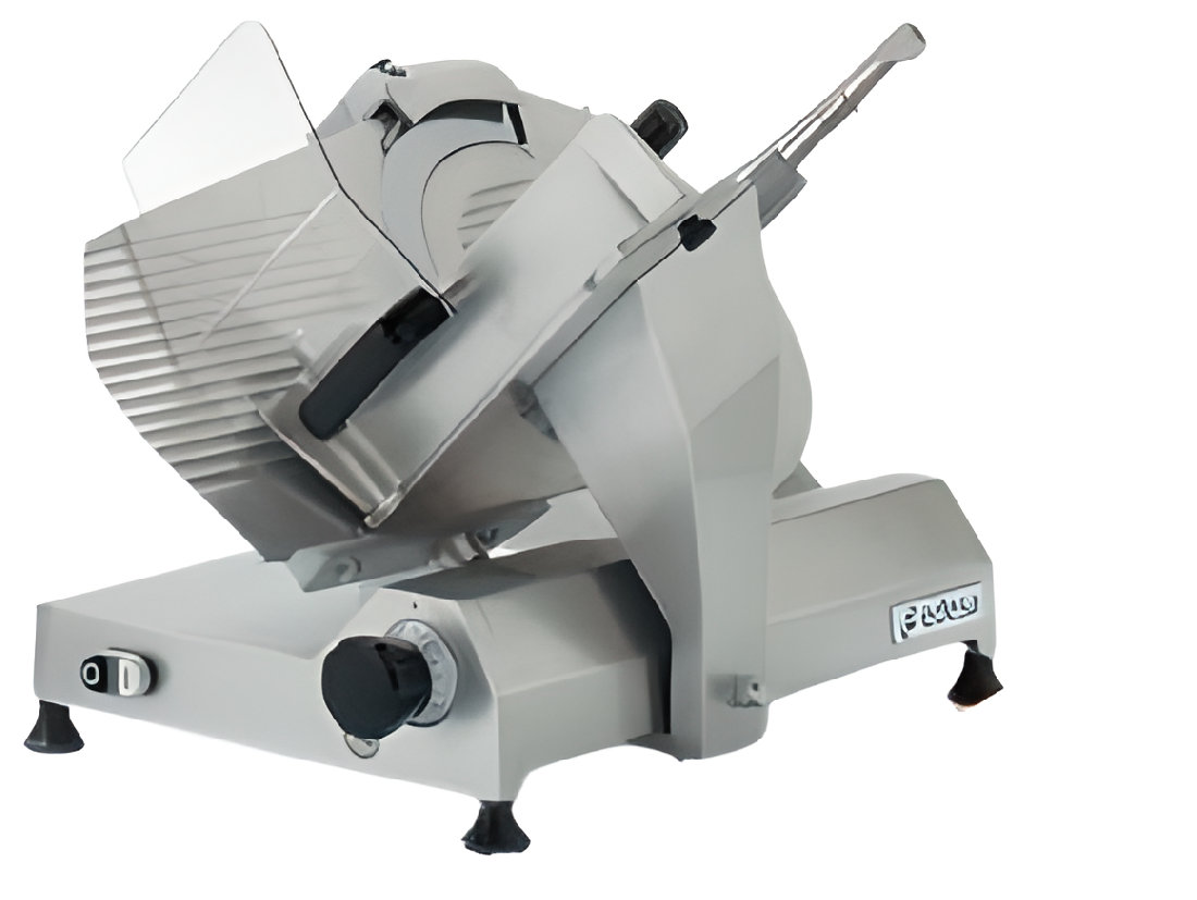 Cortadora Fiambres 350 CGP350 de Edenox, fabricada en Italia con materiales de alta calidad. Este modelo incluye transmisión por correa. Cuchillas Rasppe de alta calidad y un corte útil de 310 x 260 mm.