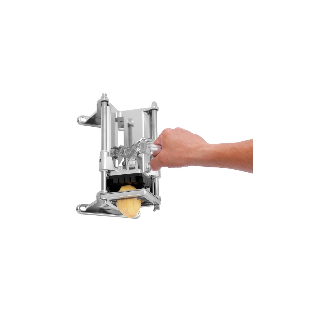 Cortadora de patatas fritas profesional, preparada para fijar a la mesa o a la pared. Cuenta con 4 rejillas intercambiables para diferentes tipos de corte. Patatas de gajo y patatas fritas en 3 grosores de corte diferentes, que puede preparar usted mismo, fácilmente y sin esfuerzo.