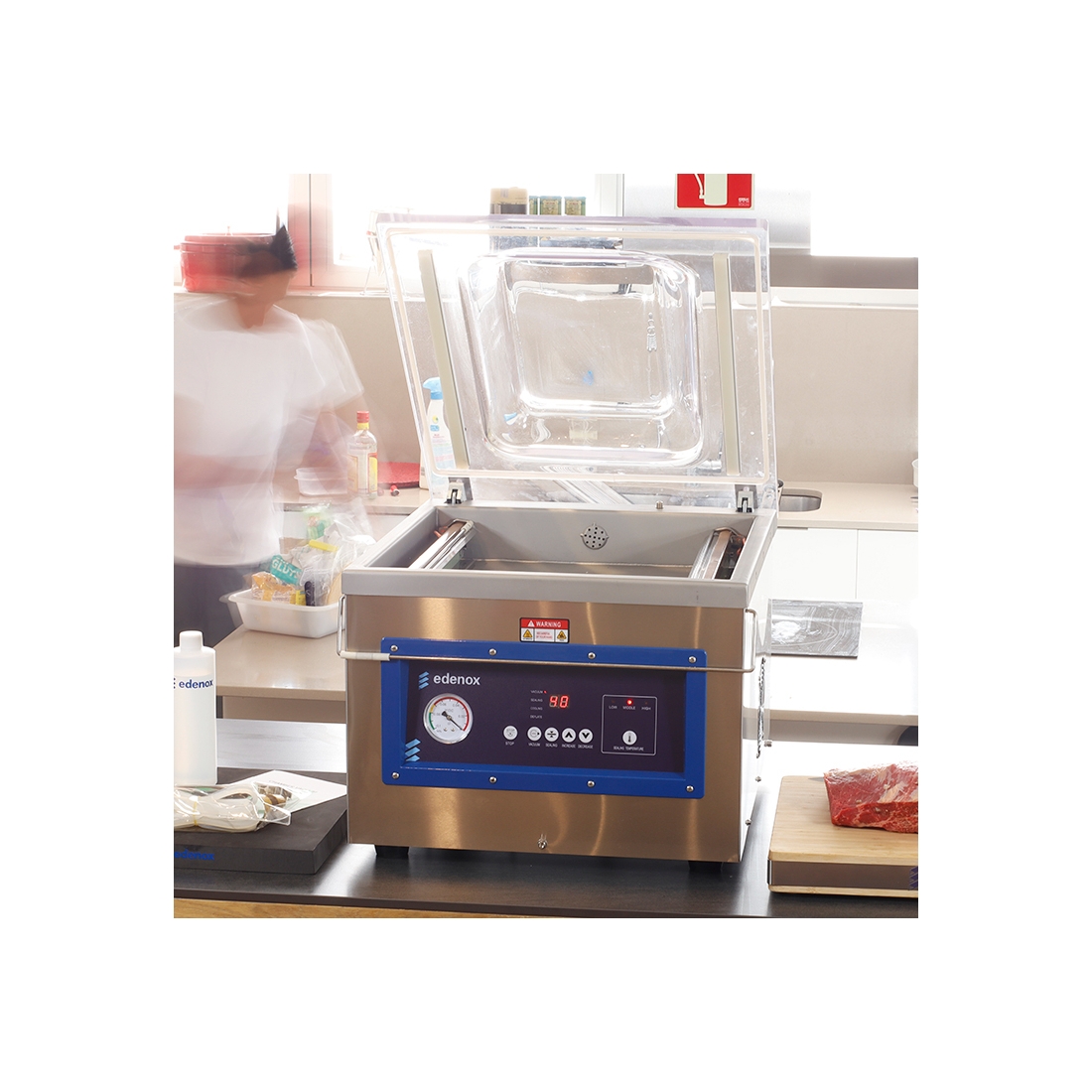 Envasadora al vacío de sobremesa, de la serie Vaksic E de Edenox, controlada por tiempo con doble barra de soldadura de 400 mm. Con bomba de vacío de 20m3/h y panel de control digital. Simplicidad profesional y eficiencia económica.