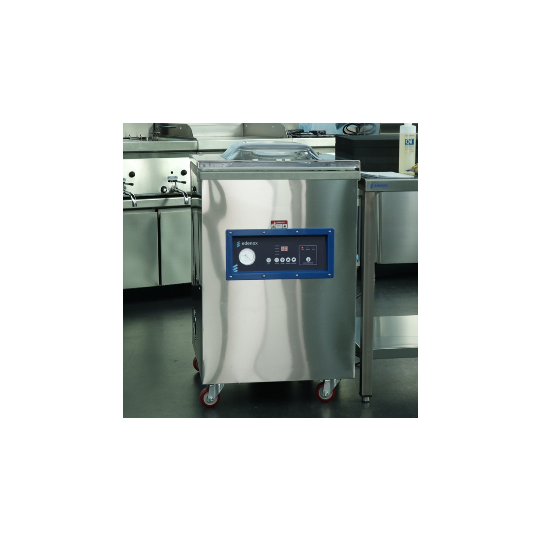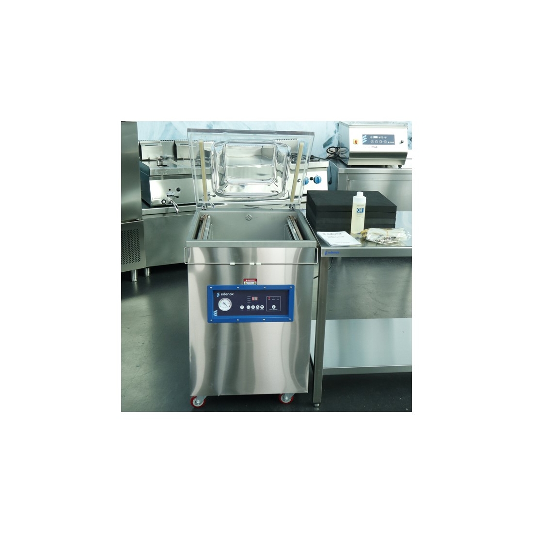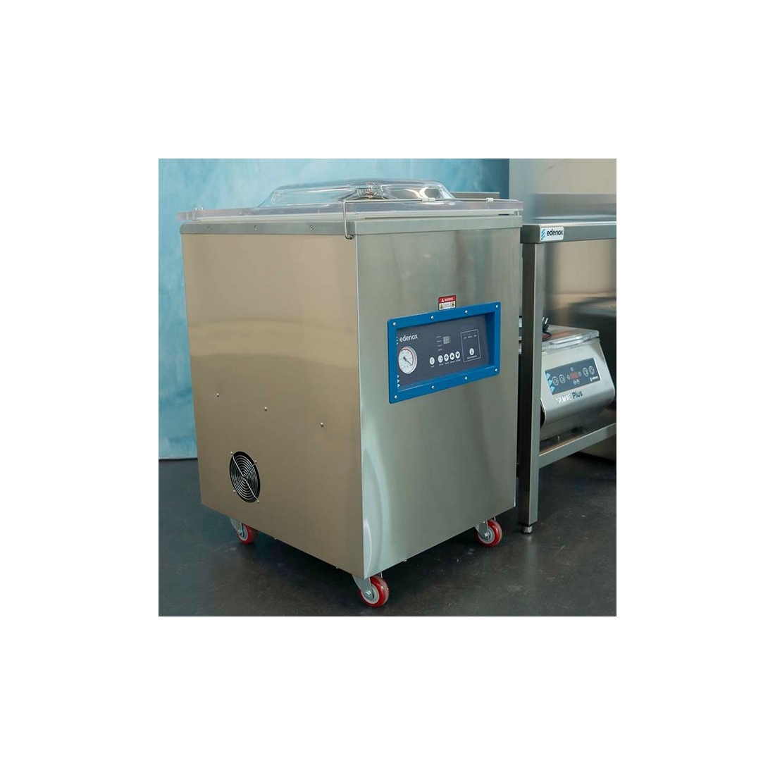Envasadora al vacío de suelo de la serie Vaksic E de Edenox, controlada por tiempo con doble barra de soldadura de 500 mm. Cuenta con bomba de vacío de 20m3/h y panel de control digital. Simplicidad profesional y eficiencia económica.