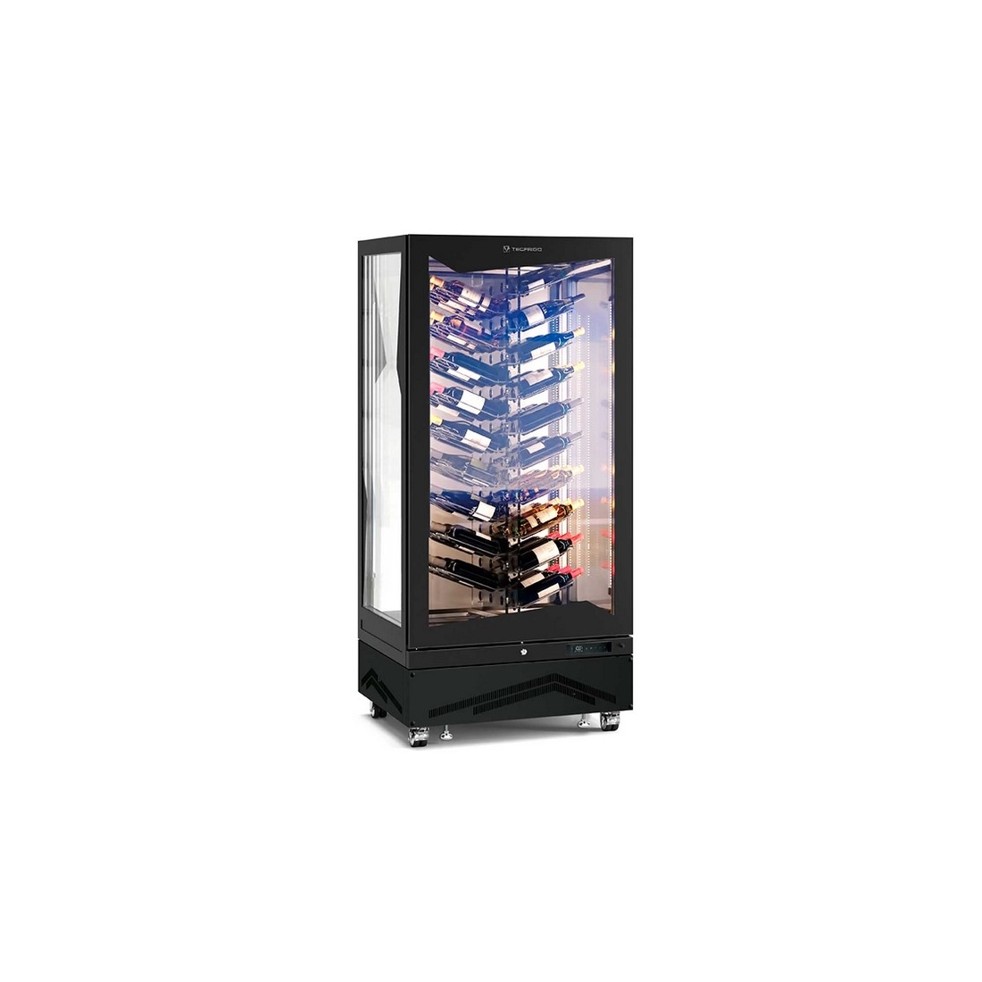 Vitrina de Vinos Refrigerada MARILYN651WINE de MasQueFrio, es una vinoteca con 4 caras de cristal muy elegante y espaciosa, cuenta con una capacidad de 114 botellas y 650 litros. El porta botellas central de metacrilato dispone de 57 aberturas para insertar las botellas por el cuello y 57 soportes de varilla para alojar otras 57 botellas en sentido inverso.