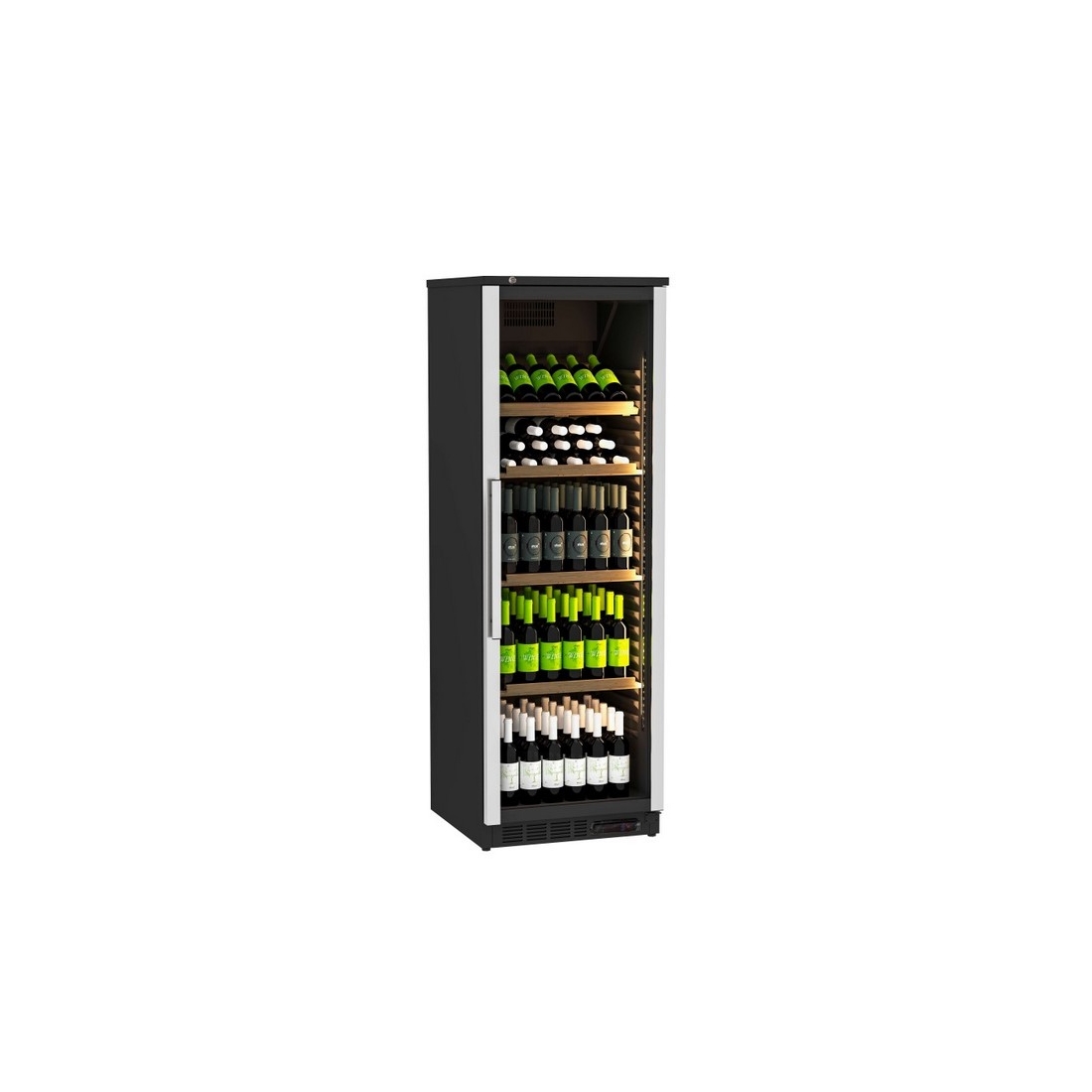 - Dotación de 3 estantes planos y 1 estante inclinado para la presentación de botellas destacadas o conservación de botellas abiertas.
