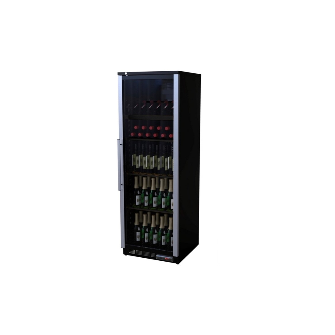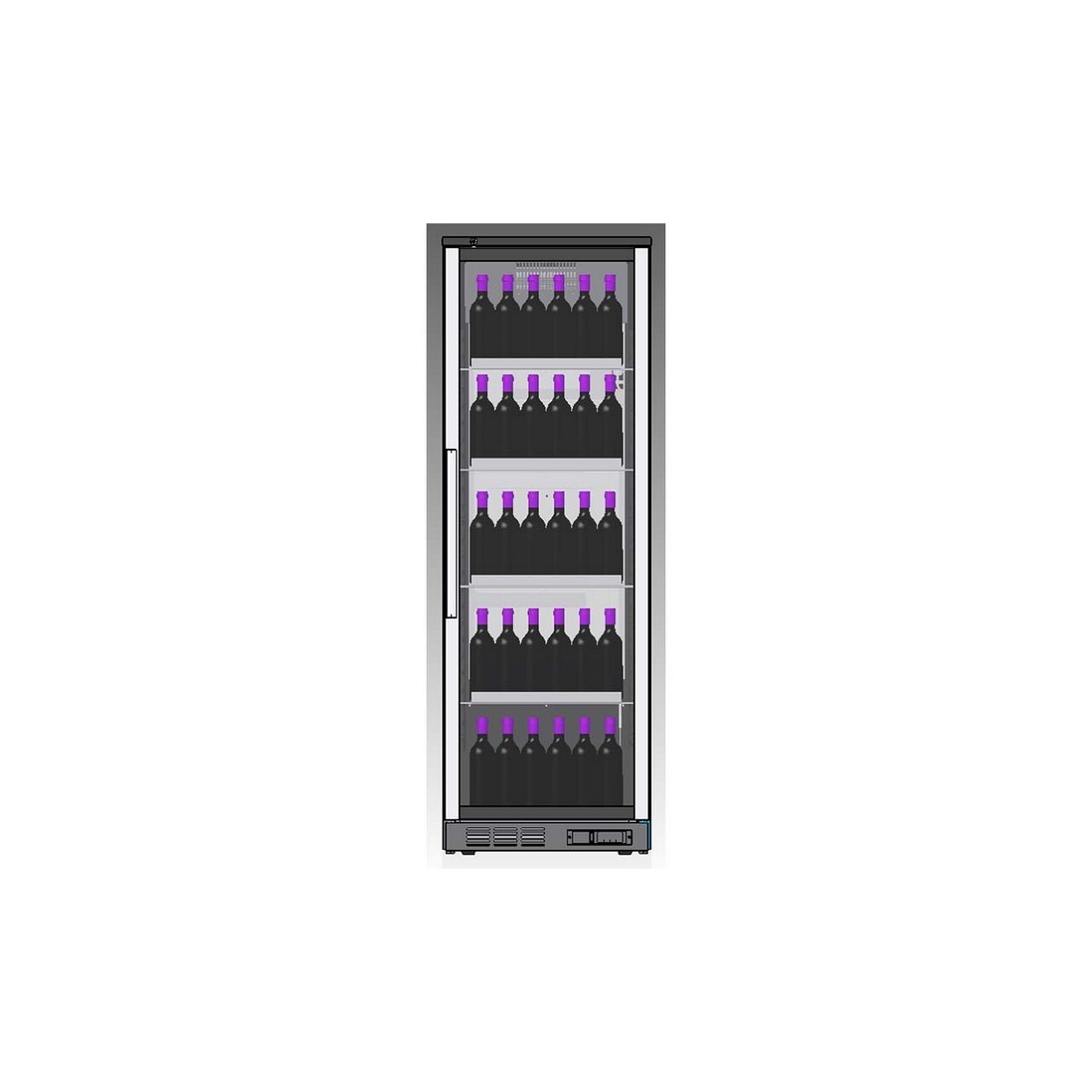 - Cuenta con una puerta y está dotado de tres estantes planos y uno inclinado de varilla plastificada en negro, lo que le da una capacidad para 72 botellas de 0,75cl. Si se colocan las botellas verticalmente en cuatro estantes horizontales, su capacidad máxima es de 138 botellas de 0,75cl.