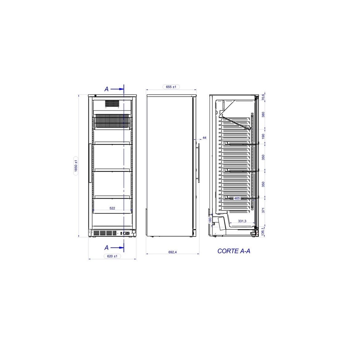 - Dimensiones externas: 620 x 655 x 1850 mm