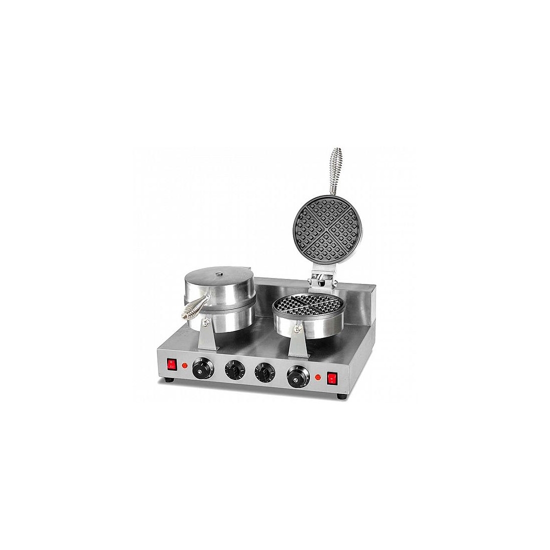 Maquina de gofres con doble placa redonda. Capacidad de 8 gofres y cuenta con dos placas redondas de: Ø170. Su potencia es de 1,0 + 1,0 Kw. Temperatura ajustable de 50 a 300ºC.