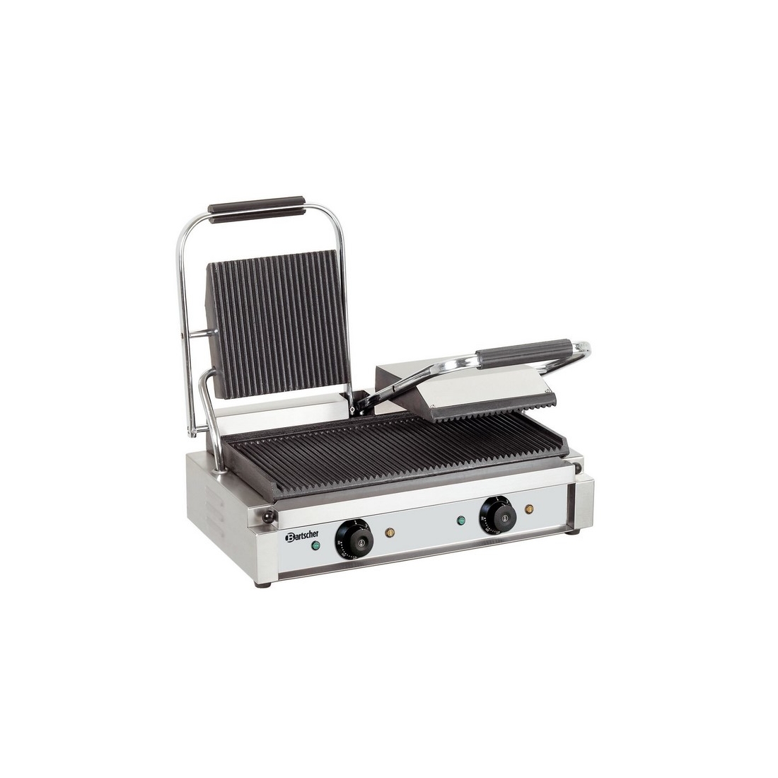 Parrilla de Contacto Profesional Doble A150671 Bartscher, con placas de hierro fundido acanaladas, cuenta con 1,8Kw de potencia y una placa útil de: 22x23cm.