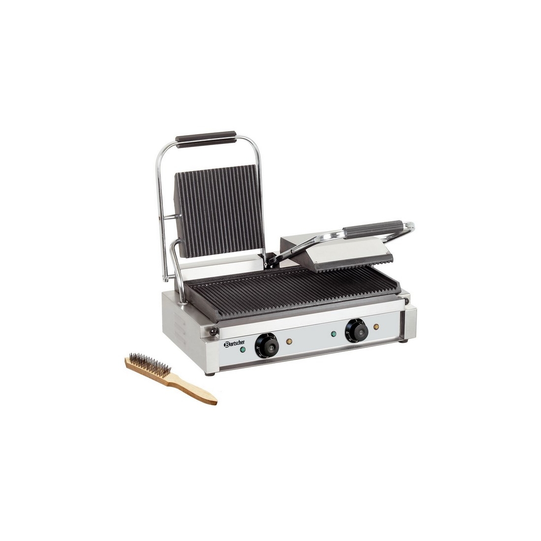 Parrilla de contacto doble con placa de hierro fundido acanalada. Cuenta con una potencia de: 3,6 Kw. Superficie útil: 47 x 23cm. ¡Incluye cepillo para la limpieza!