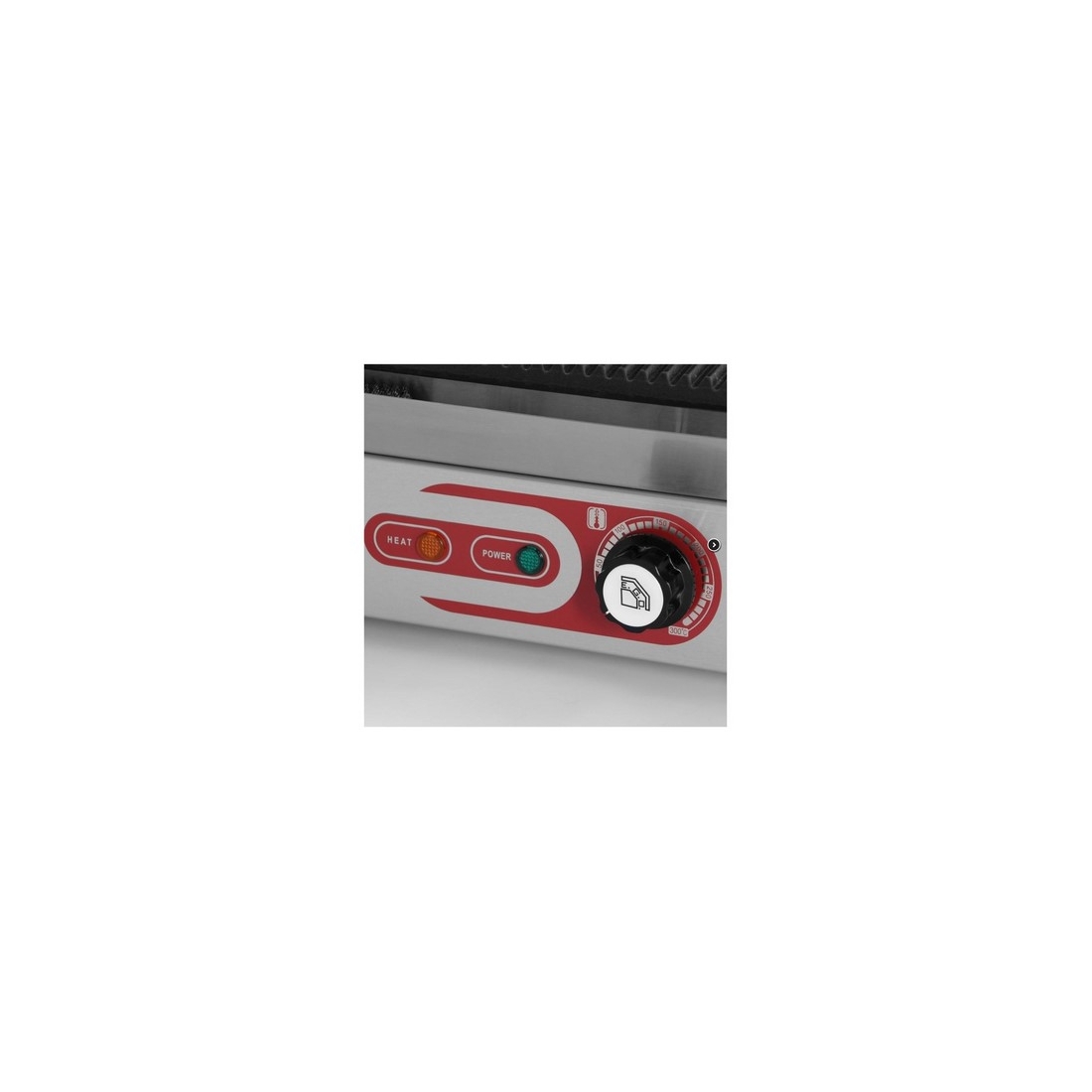 Grill eléctrico mediano de un solo cuerpo construido en acero inoxidable de alta eficiencia térmica. Las placas son esmaltadas y acanaladas. Tiene un rango de temperatura de 50ºC a 300ºC. Incluye cajón recoge grasas.