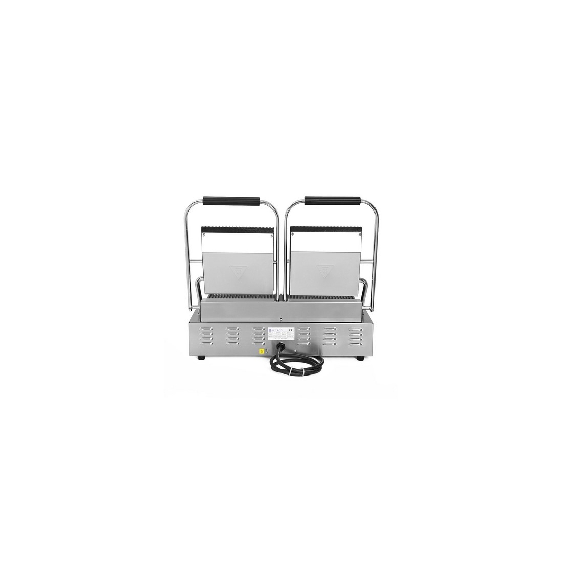 Grill eléctrico grande de doble cuerpo construido en acero inoxidable de alta eficiencia térmica. Las placas son esmaltadas y acanaladas. Tiene un rango de temperatura de 50ºC a 300ºC. Incluye cajón recoge grasas y patas de goma. Medidas: 59 x 36 cm
