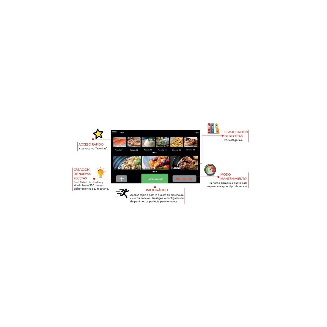 - Capacidad de almacenamiento de hasta 300 recetas