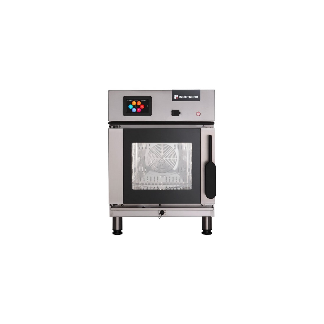 Horno Gastronomía Compacto 4 Bandejas CTDT104E Inoxtrend, es un horno mixto con pantalla digital pequeño, con solo 52cm de ancho. Gracias a su pantalla táctil podrás programar diferentes modalidades como por ejemplo, lavado automático, precalentamiento automático, función cook and hold...