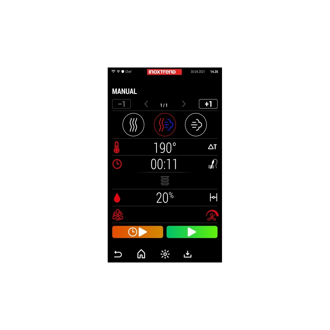 - Horno profesional de gastronomía serie PROFESSIONAL LEVEL UP de Inoxtrend, con capacidad para 11 bandejas GN 1/1 y pantalla digital táctil, desde la que podrás programar diferentes funciones.