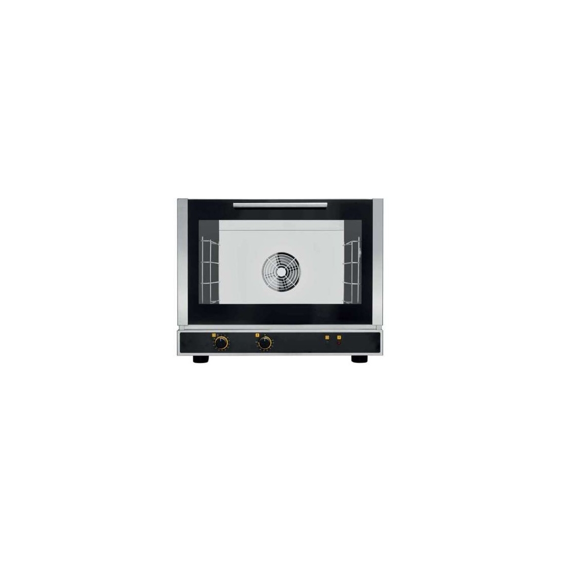 Horno de convección eléctrico, con panel de mandos electromecánico. Tiene capacidad para 4 bandejas de 60x40 cm. Una temperatura máxima de 300ºC. Y unas medidas reducidas de 790 x 775 x 635 mm. El motor es bidireccional. Conexión monofásica.