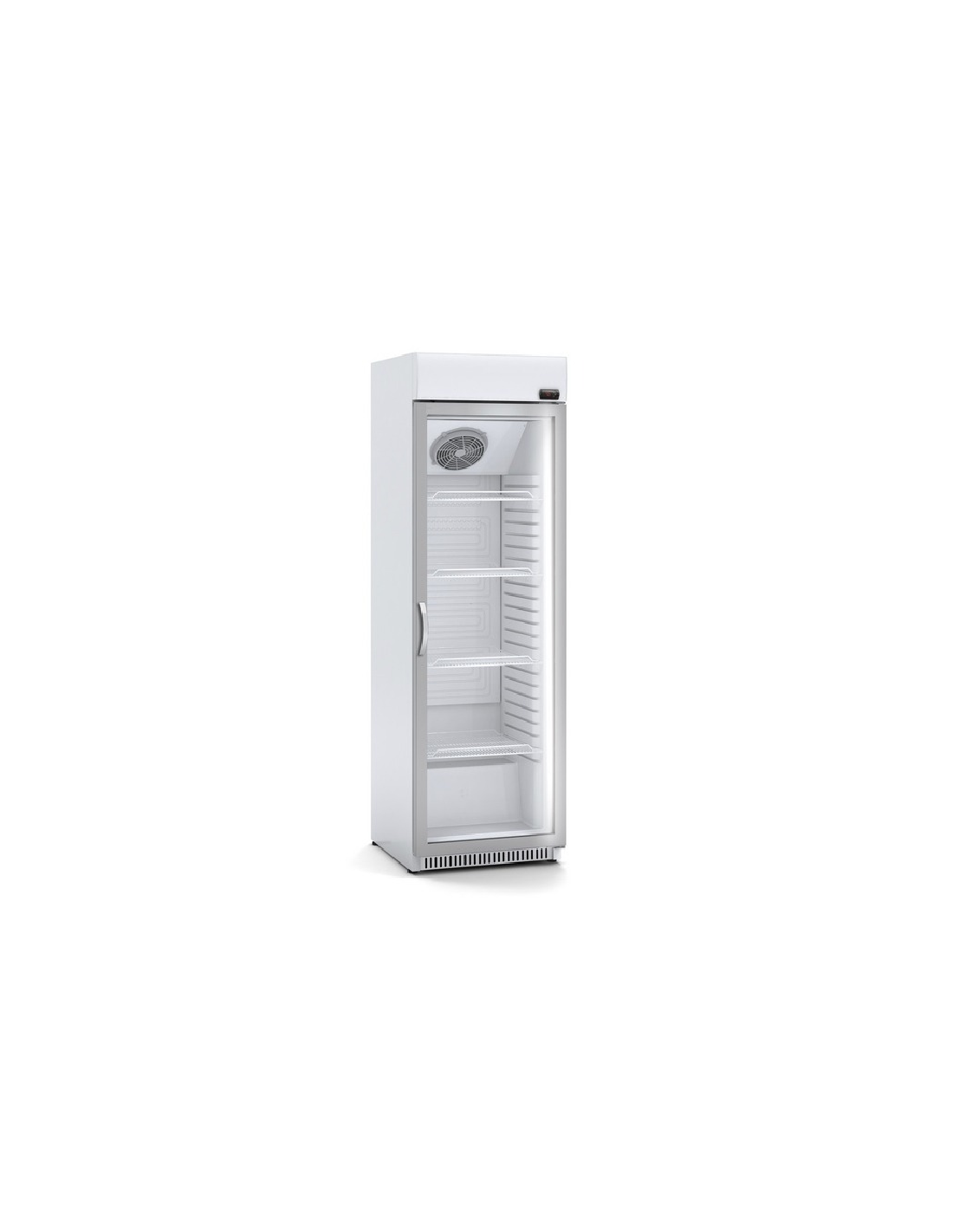 Armario expositor refrigerado de 400 litros para bebidas y envasados, con temperatura +0 a +7 °C y evaporador ventilado para frío uniforme. Puerta de doble vidrio, iluminación LED y control digital de temperatura y desescarche, con cabezal luminoso. Medidas: 620 x 640 x 2000 mm.