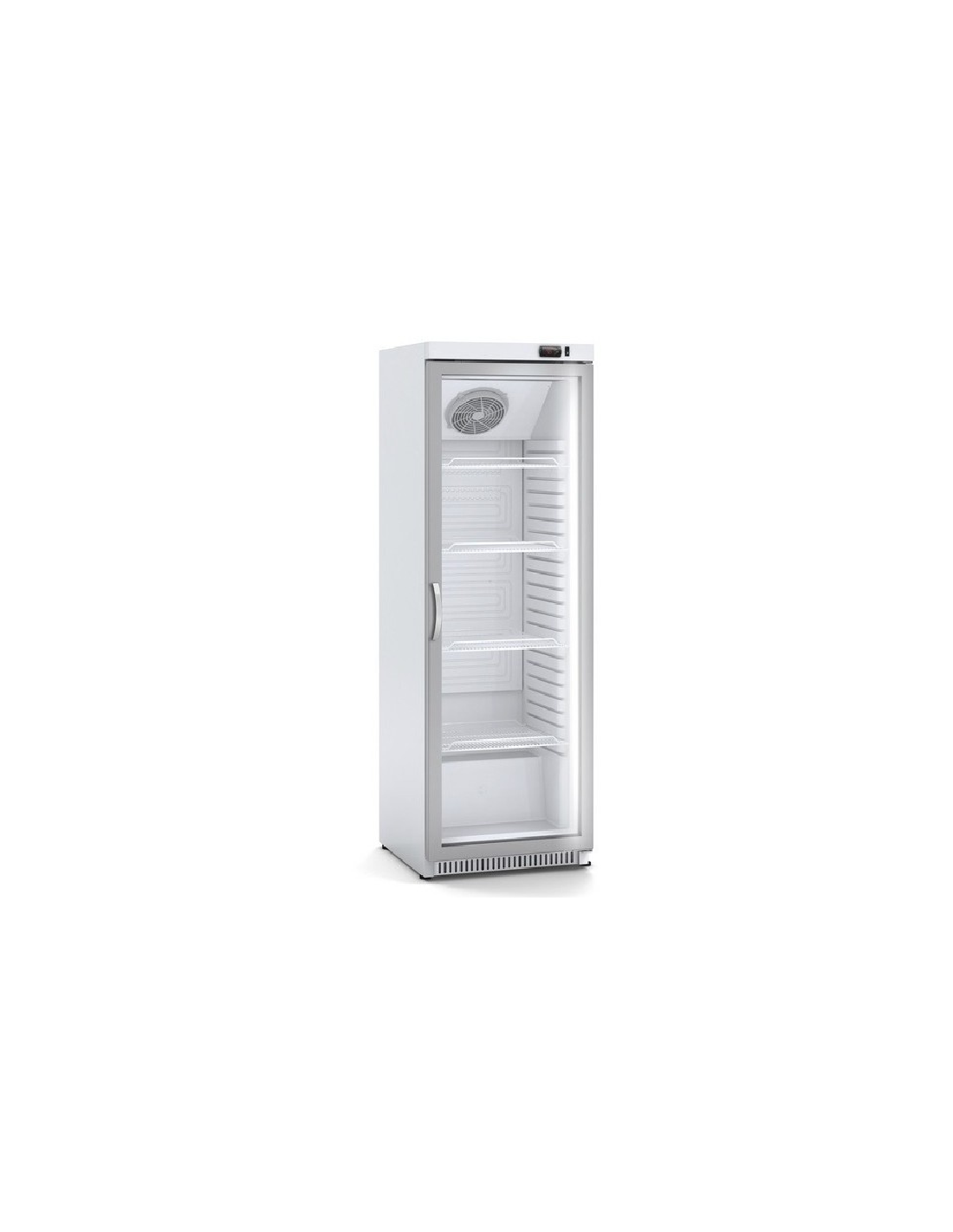 Armario expositor refrigerado de 400 litros para bebidas y envasados, con temperatura +0 a +7 °C y evaporador ventilado para frío homogéneo. Puerta de doble vidrio, estantes regulables y control digital de temperatura y deshielo con iluminación LED. Medidas: 620 x 640 x 2000 mm.