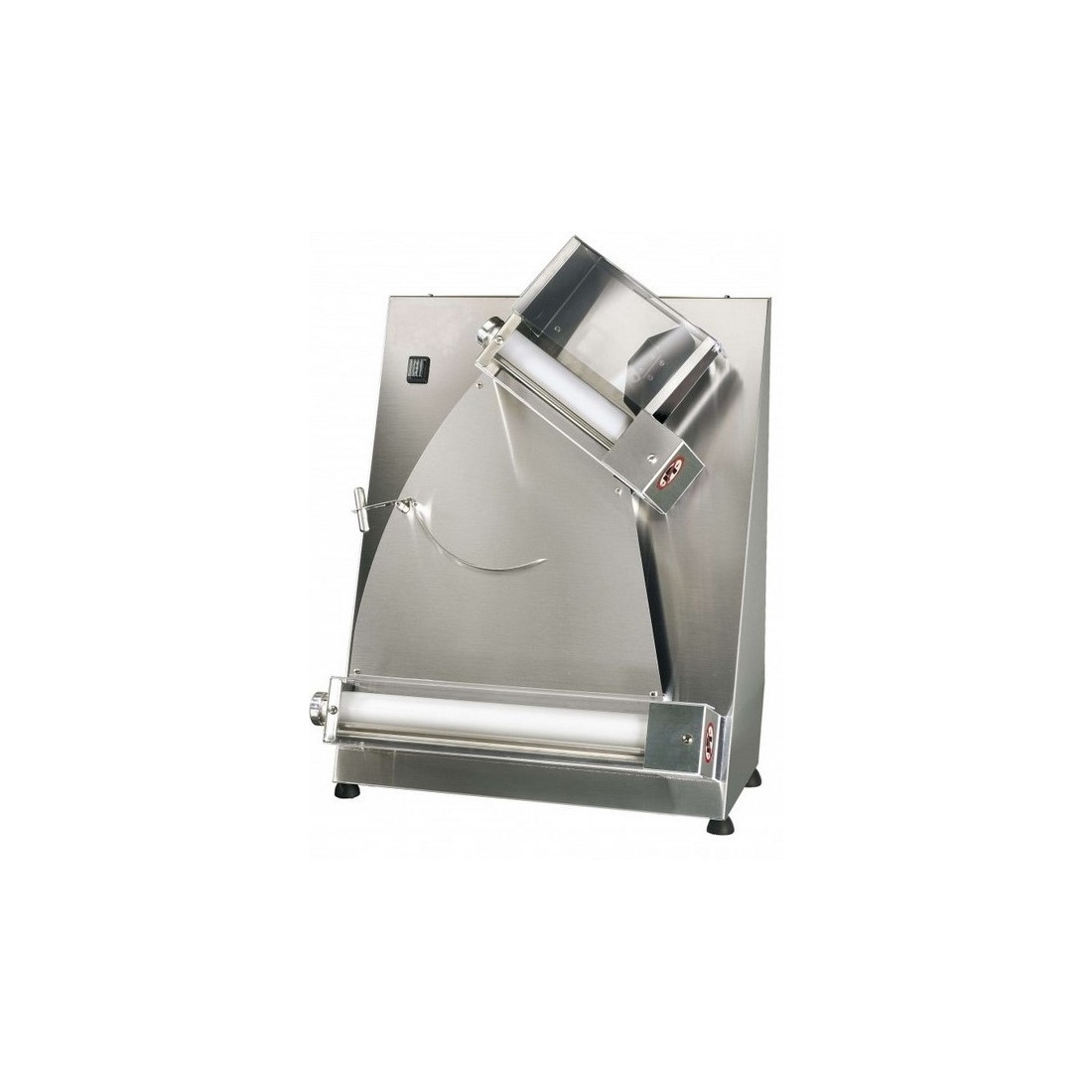 Formadora de pizzas para diámetros de 260 a 420mm, con dos rodillos de resina alimentaria. Esta fabricada en acero inoxidable, su potencia es: 370W. Cuenta con pedal de accionamiento.